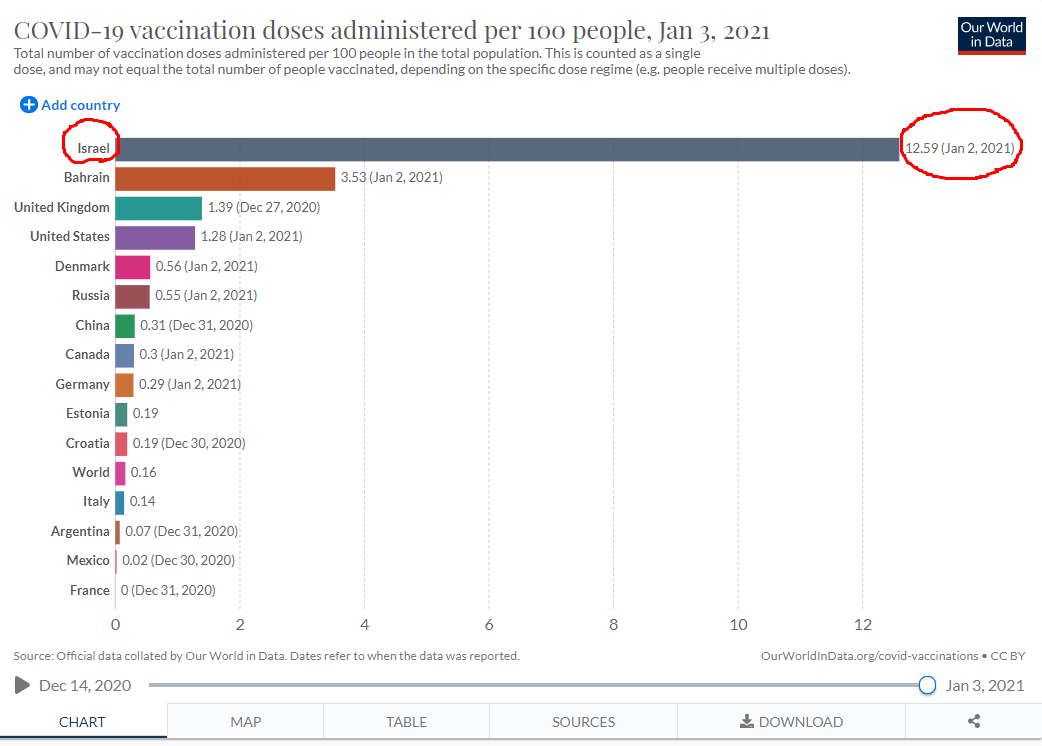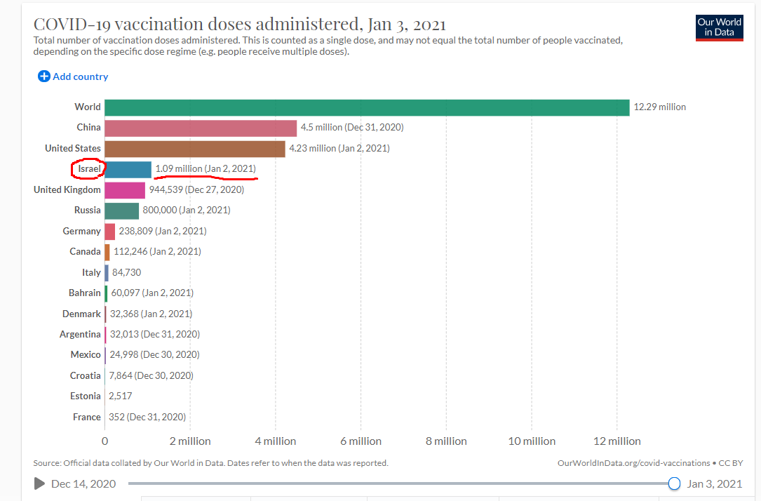 이스라엘이 화이자백신접종을 시작하기는 12월 20일이니, 현지시각 3일 109만 명을 돌파했으니, 그 속도야 광속임은 말할 나위가 없거니와, 1차 접종이기는 하지만 그 접종율이 11%에 도달했다. 최근에는 그 속도가 더 가팔라져 하루 15만 명한테 아야 주사를 놨다.