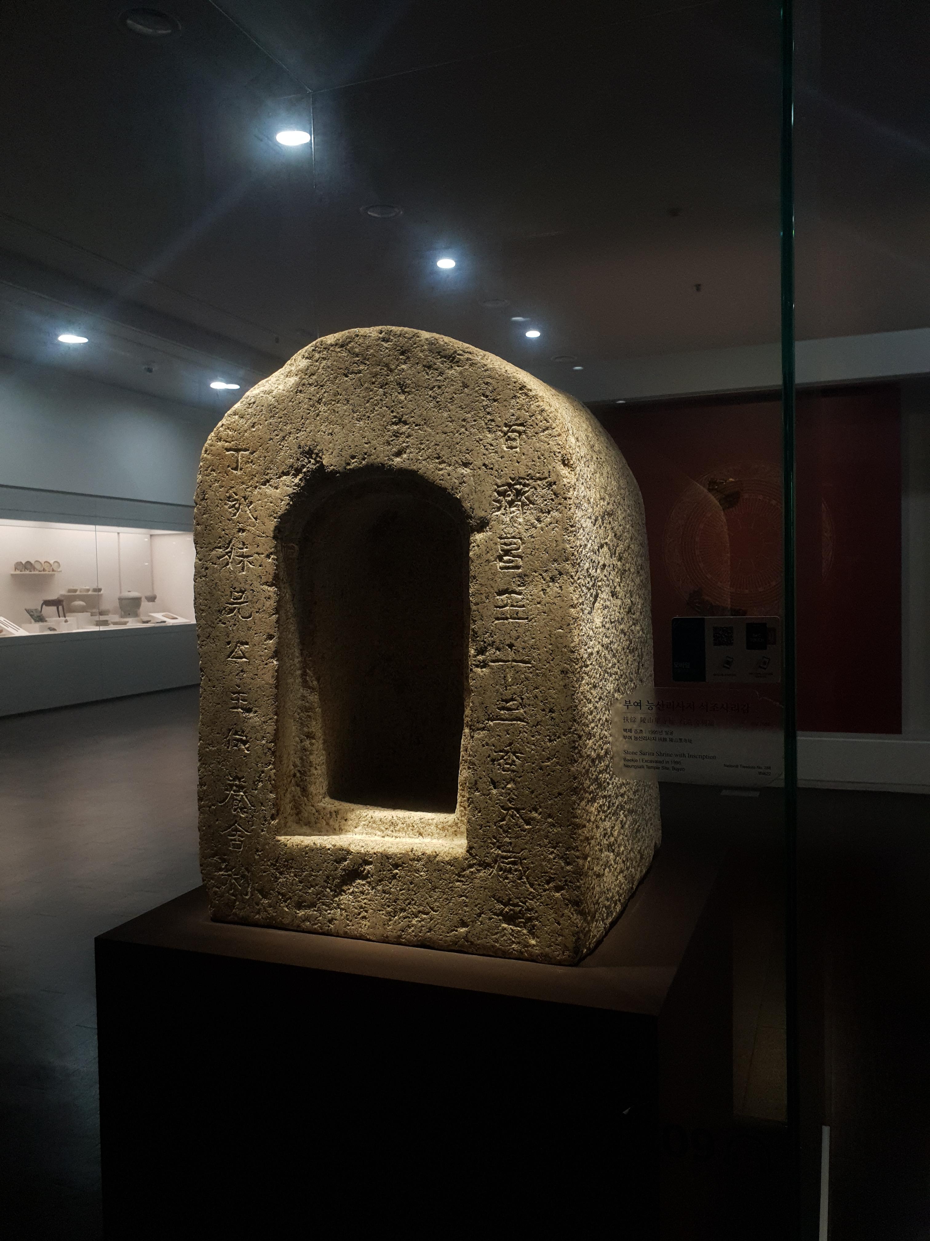 百济时代用于保管舍利的容器,在陵山里寺址的位于中央的木塔下面发现的。这个舍利龛作为研究百济历史的新的金石文资料,是可以了解百济和中国的文化交流情况的资料,供奉者和供奉舍利的年代确切,在百济寺址当中通过当时的遗物确认寺院创建年代的最早作品。