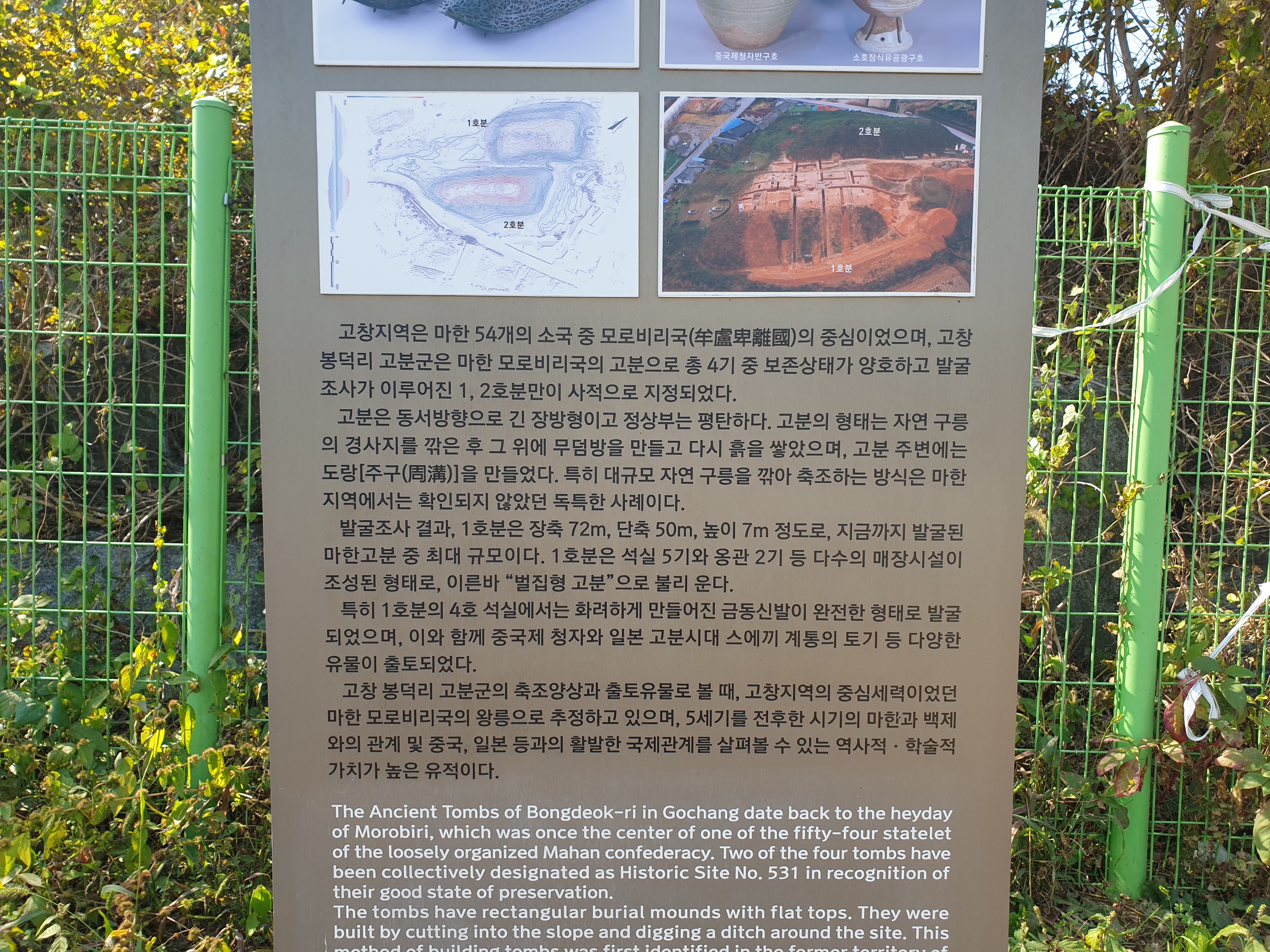 고창지역은 마한 54개 소국 중 모로비리국牟盧卑離國의 중심이었으며, 고창 봉덕리 고분군은 마한 모로비리국의 고분으로 총 4기 중 보존상태가 양호하고 발굴조사가 이루어진 1, 2호분만이 사적으로 지정되었다.
