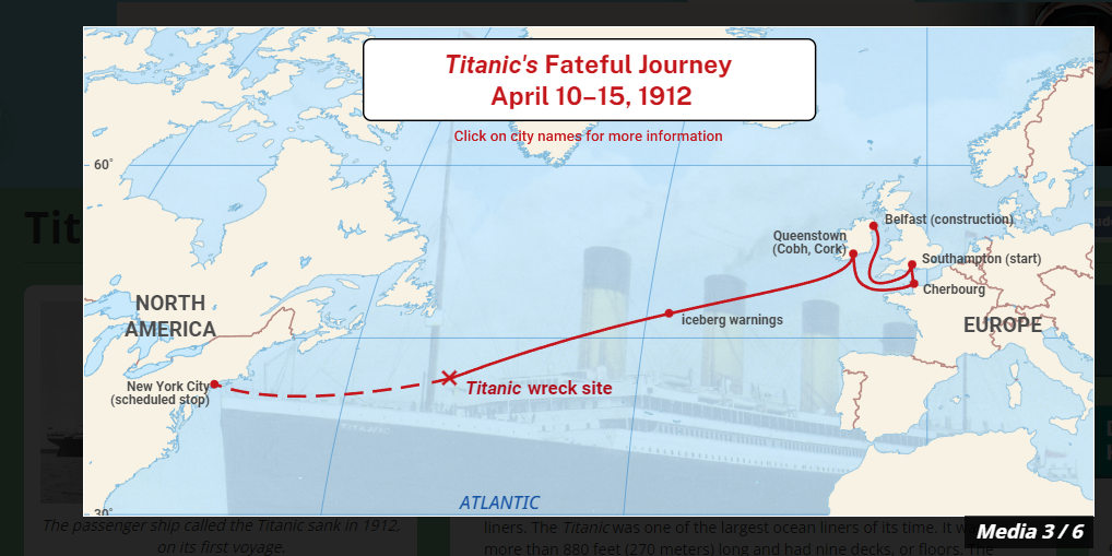 1912년 4월 10일 영국 남부 항구 사우샘프턴을 출항해 프랑스 셰르부르Cherbourg와 아일랜드 퀸즈타운에 기항했다가 기착지인 미국 뉴욕으로 향하던 첫 항해 중에 4월 15일, 빙산과 충돌해 뉴펀들랜드 해안 남쪽 약 680㎞ 떨어진 지점에서 침몰해 현재 그 해저 4천m 심해에 잔해가 남았다.