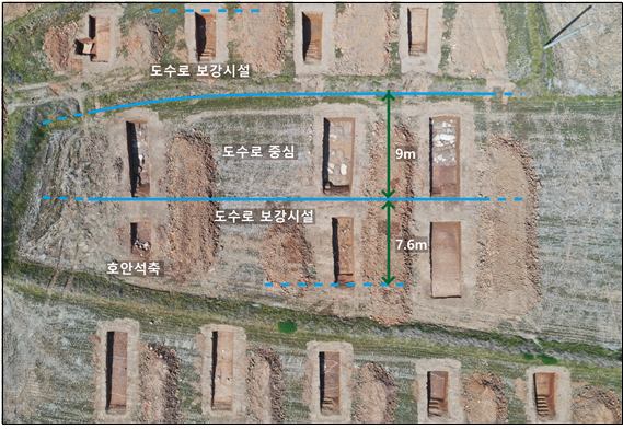 도수로의 바닥은 0.9~1.5m 크기의 대형 판석을 깔았고, 대형 판석 사이는 작은 판석이나 할석을 다듬어 빈틈없이 메꾸었다. 또한 도수로의 남쪽 보강시설 끝에는 호안석축시설이 일부 잔존하고 있다. 도수로는 시굴조사 범위 바깥인 동쪽방향으로 계속 이어지고 있어, 현재 확인된 규모보다 휠씬 컸을 것으로 추정된다.