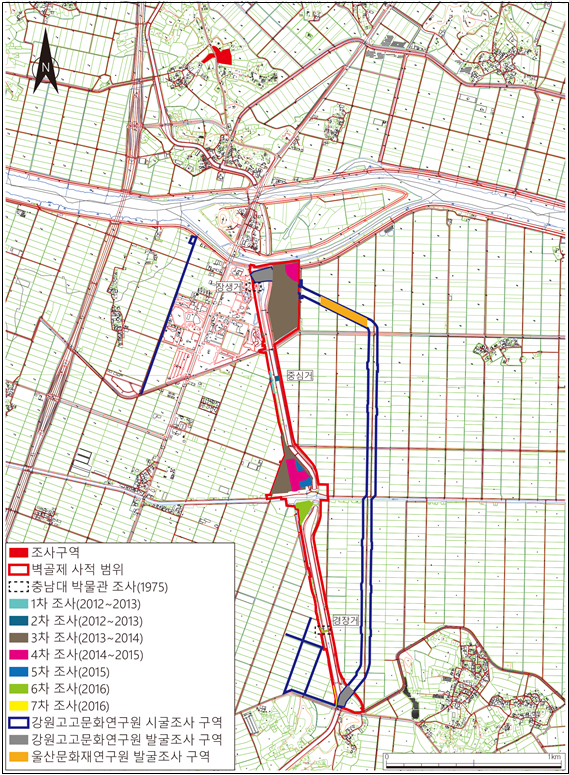 이와 함께 제외堤外 지역(관개지역)에서 자연지형을 이용한 대규모 방수로放水路의 존재도 파악할 수 있었다.