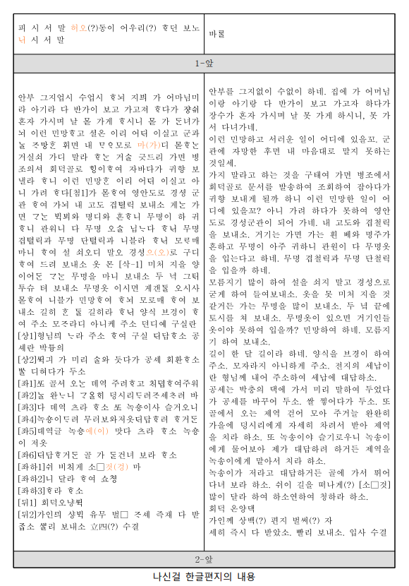 문화재청이 보물 지정을 예고한 나신걸 한글편지는 500년 전 언문이라, 여기서는 자판을 지원하지 못해서 긁어다가 사진으로 제시하고 대신 그 현대어 옮김을 첨부한다.