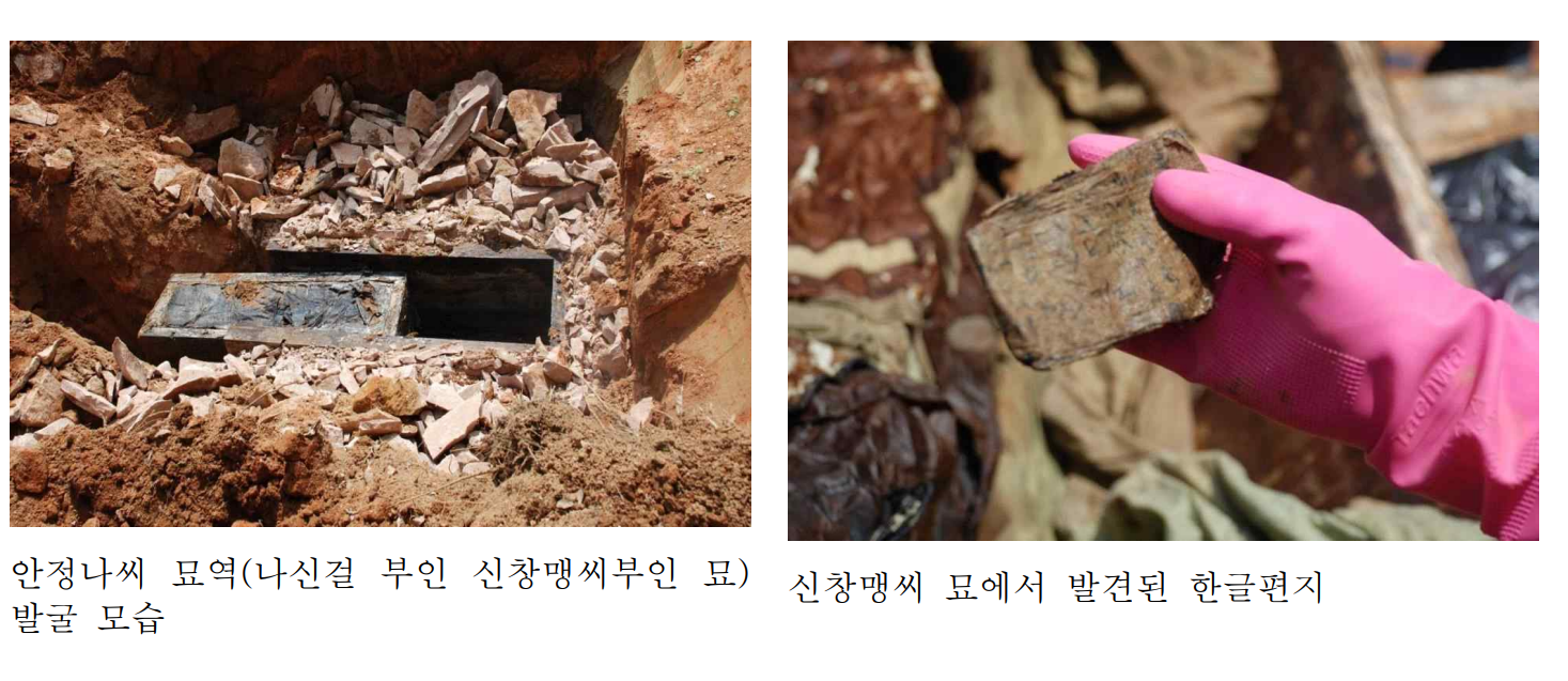 이 중 한글편지는 피장자의 머리맡에 놓여 있었다. 편지는 총 2점이며, 비교적 정연하게 쓴 편지로 여러 번 접힌 상태에서 출토되었다.2)