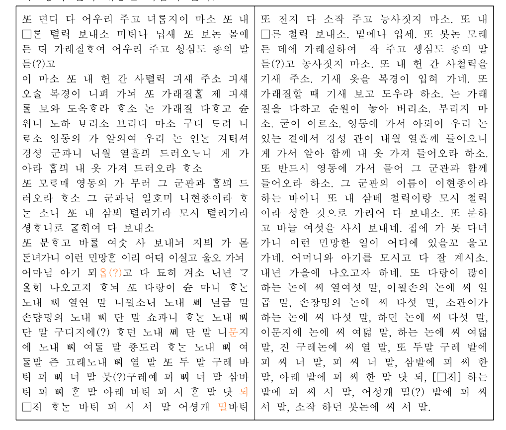 또 전지 다 소작 주고 농사짓지 마소. 또 내 □른 철릭 보내소. 밑에나 입세. 또 봇논 모래 든 데에 가래질하여 작 주고 생심도 종의 말 듣(?)고 농사짓지 마소. 또 내 헌 간 사철릭을 기새 주소. 기새 옷을 복경이 입혀 가네. 또 가래질할 때 기새 보고 도우라 하소. 논 가래 질을 다하고 순원이 놓아 버리소. 부리지 마 소. 굳이 이르소. 영동에 가서 아뢰어 우리 논 있는 곁에서 경성 관이 내월 열흘께 들어오니 게 가서 알아 함께 내 옷 가져 들어오라 하소. 또 반드시 영동에 가서 물어 그 군관과 함께 들어오라 하소. 그 군관의 이름이 이현종이라 하는 바이니 또 내 삼베 철릭이랑 모시 철릭 이라 성한 것으로 가리어 다 보내소. 또 분하 고 바늘 여섯을 사서 보내네. 집에 가 못 다녀 가니 이런 민망한 일이 어디에 있을꼬 울고 가네. 어머니와 아기를 모시고 다 잘 계시소. 내년 가을에 나오고자 하네. 또 다랑이 많이 하는 논에 씨 열여섯 말, 이필손의 논에 씨 일 곱 말, 손장명의 논에 씨 다섯 말, 소관이가 하는 논에 씨 다섯 말, 하던 논에 씨 다섯 말, 이문지에 논에 씨 여덟 말, 하는 논에 씨 여덟 말, 진 구레논에 씨 열 말, 또 두말 구레 밭에 피 씨 너 말, 피 씨 너 말, 삼밭에 피 씨 한 말, 아래 밭에 피 씨 한 말 닷 되, [□] 하는 밭에 피 씨 서 말, 어성개 밀(?) 밭에 피 씨 서 말, 소작 하던 봇논에 씨 서 말.