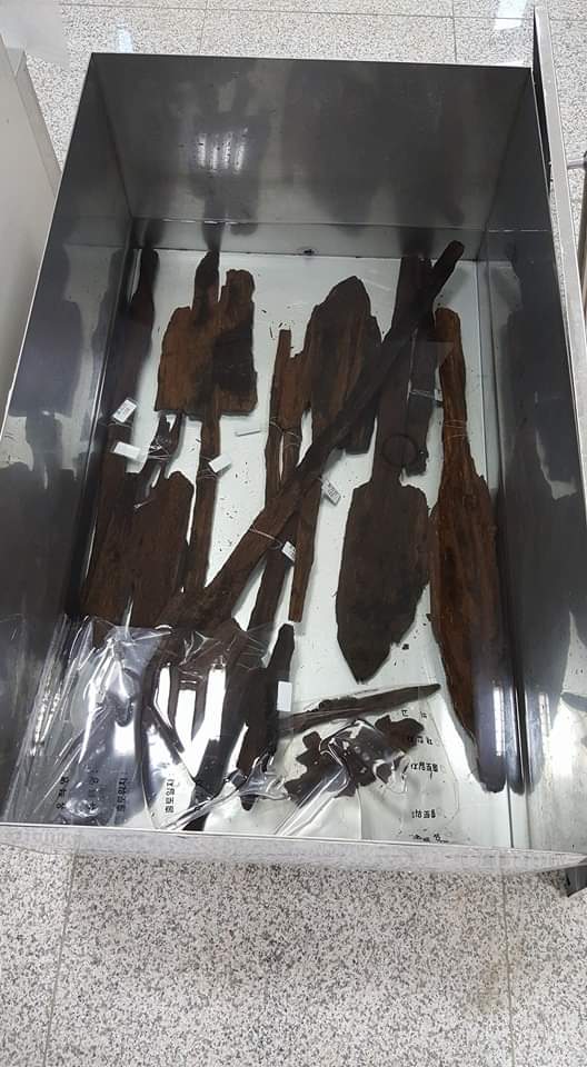궁남지 인근 부여 화지산 유적 백제시대 건물터 인근에서 발굴한 나무삽 열한자루가 보존처리를 위해 식염수에 잠수 중이다.