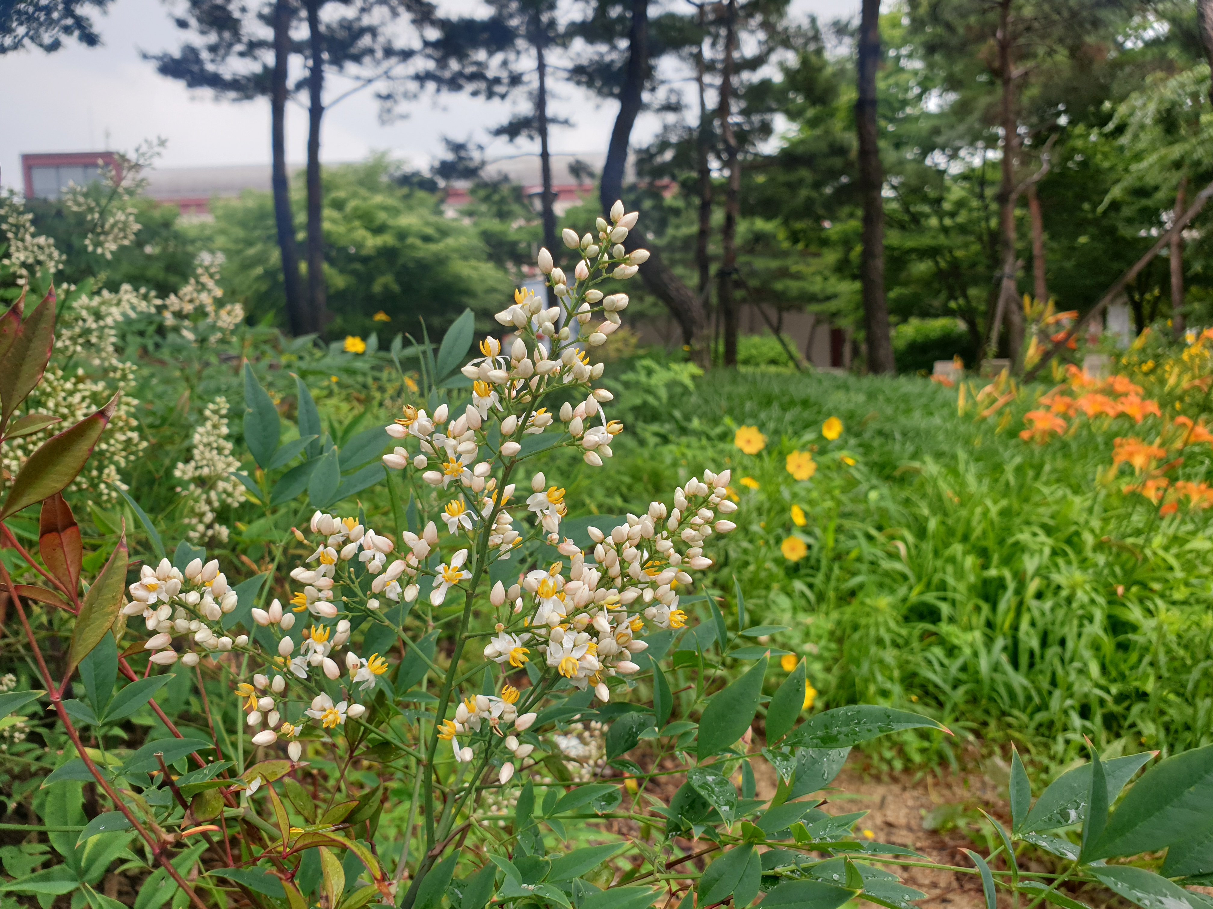 비 내린 직후 꽃풀이 막 샤워하고는 물기 머금었다.