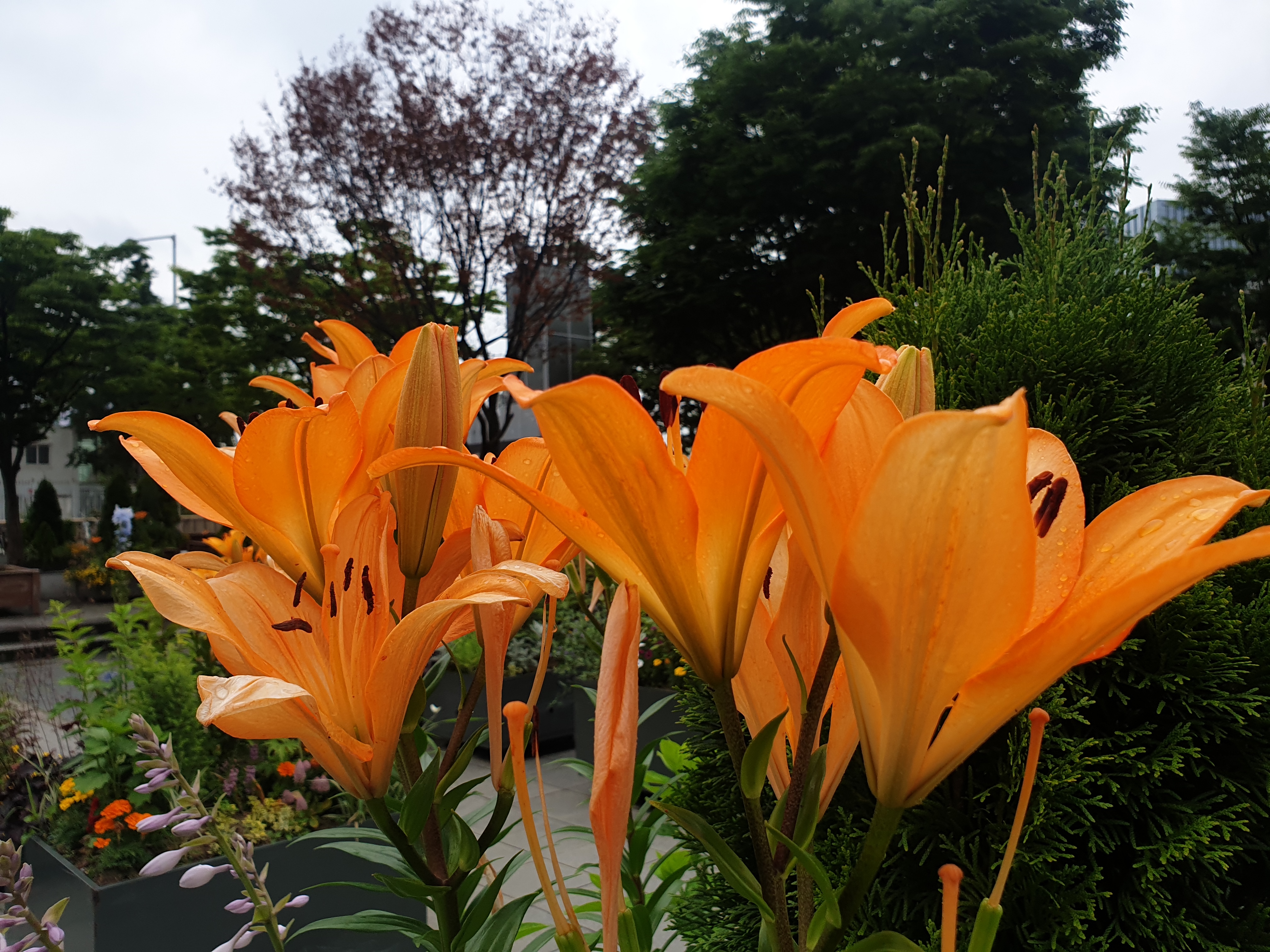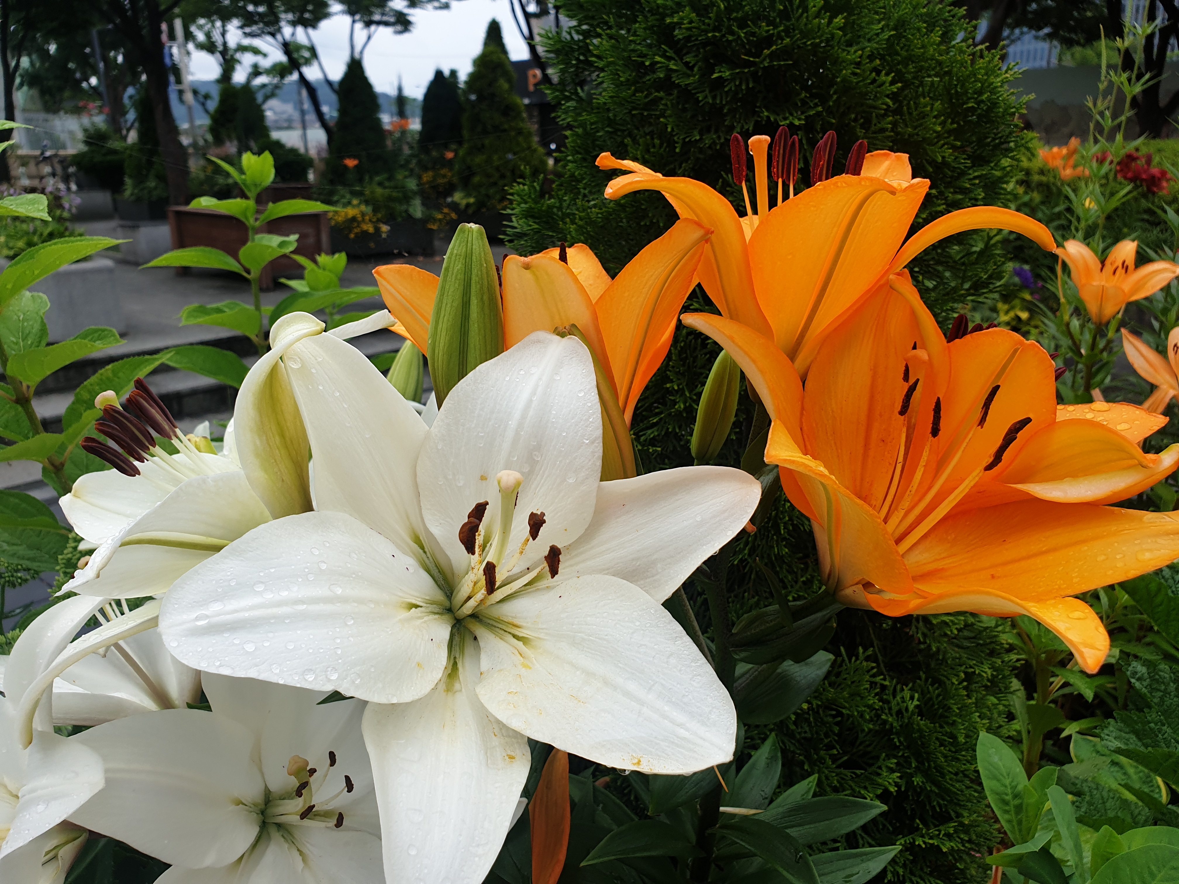 비 내린 직후 꽃풀이 막 샤워하고는 물기 머금었다.