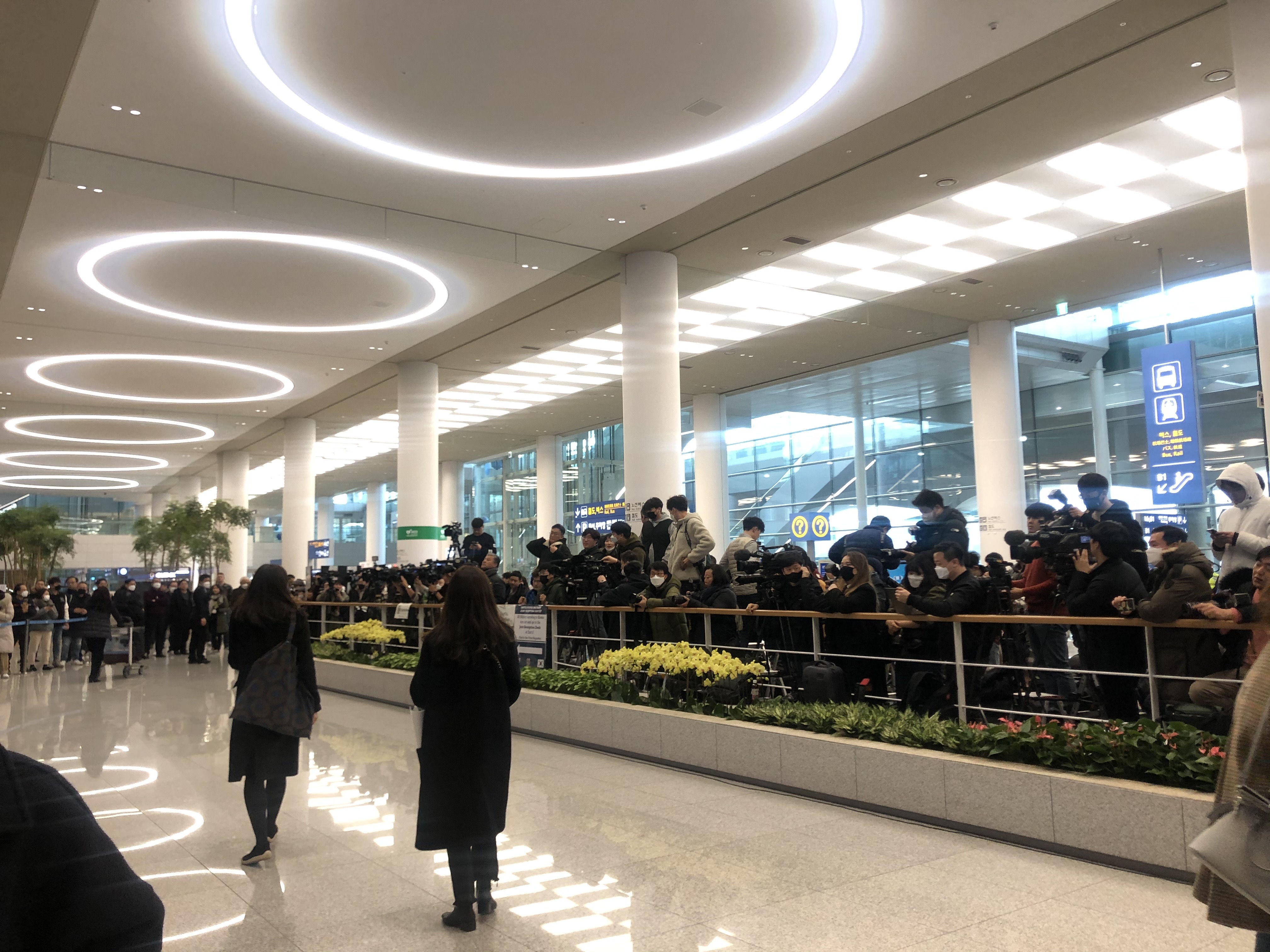봉준호가 인천공항 제2터미널을 통해 조금전 대략 여섯시쯤 공항을 빠져나왔습니다.