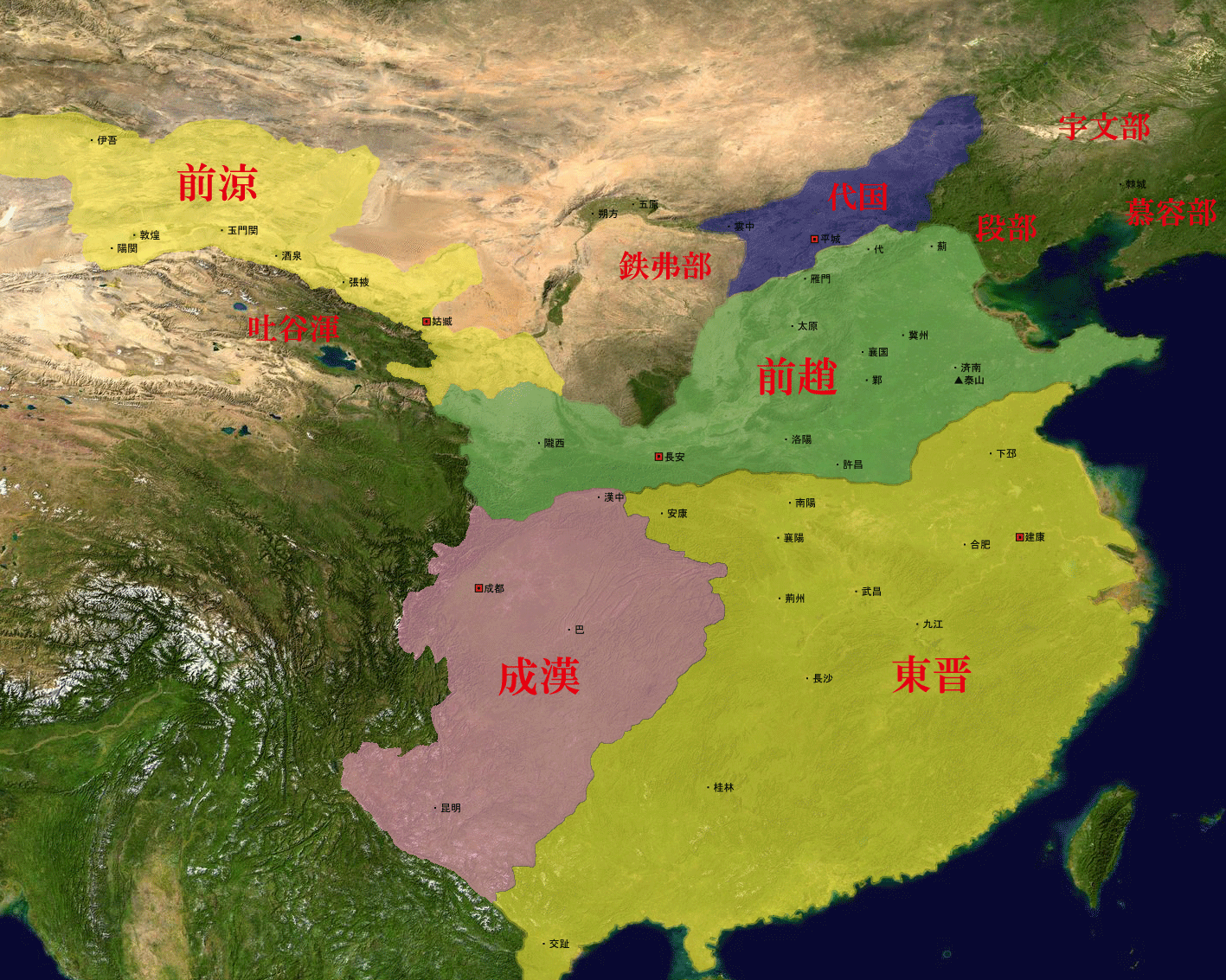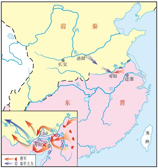 (1) 차빈車頻은 《진서秦書》에서 이렇게 기술했다. 「부견符堅은 字가 영고永固이며, 무도武都의 저족氐族이다. 본래 성姓은 포蒲씨이니 할아버지 포홍蒲洪은 도참문으로 사람들을 잘 속이면서 성을 부符로 바꾸었으니 그러면서 말하기를 왕이 될 것이라 마땅히 천명에 부응해야 한다고 했다. 부견이 태어날 적에 붉은빛赤光이 산실로 스며들었는데 태어나 보니 등짝에 붉은색 기운이 슬쩍 비쳤는데 전서篆書 같았다. 어려서 기량이 훌륭했으니, 석호石虎의 사예司隸 벼슬로 있던 서정徐正이 사람을 알아보는 능력으로 이름이 높았으니 부견이 6살 적에 길에서 노는 장면을 보면서 서정이 기이하게 여기며 묻기를 "이보게 부씨집 도련님. 이곳은 관리들이 다니는 길이라 어린이가 뛰어노는 데가 아닌데 잡혀가지 않을까 두렵지 않니?" 하니. 부견이 대답하기를 "관리들은 죄 있는 사람만 잡아가지 저 같은 어린애는 잡아가지 않아요"라고 했다. 서정이 좌우 사람들테 말하기를 "이 아이한테는 왕이 되어 세상을 제패할 상이 있다"고 했다. 석씨石氏가 난을 일으키자 큰아버지伯父 부건符健과 아버지 부웅符雄은 서쪽으로 가서 관중關中으로 들어갔다. 부건이 꿈에 천신天神의 사자使者가 붉은옷과 관朱衣冠을 걸치고서는 견두肩頭를 용양장군으로 삼는 것을 보았다. 견두肩頭는 부견의 어릴 적 字다. 부건은 즉시 부견을 용양장군에 임명함으로써 신명神命에 부응하고자 했다. 나중에 부건이 참람되게도 황제를 자칭했다. 부건이 죽고서 그 아들이 섰지만 흉폭凶暴해 뭇 신하가 그를 죽이고는 부견을 세웠다. 부견은 재위 15년째가 되자 장락공長樂公 부비符丕를 보내 양양襄陽을 공격해 함몰했다. 19년에는 대대적으로 군사를 일으켜 잔晉 정벌에 나서니 말하기를 백만이라 하면서 뭍과 강을 통해 동시 진격하고는 항성項城에 머물렀다. 항성에서 장안長安에 이르기까지 이어진 깃말이 천리였으며 머리와 꼬리가 끊어지지 아니했다. 그러고선 사신을 보내 晉에 이르기를 "晉 군왕을 위해 장안성長安城에 고래등 같은 저택을 만들어 놓았으니 이제 군사를 대대적으로 이끌고서는 강을 건너 영접할 것이니 날짜를 골라 저택으로 들어오시오"라고 했다.