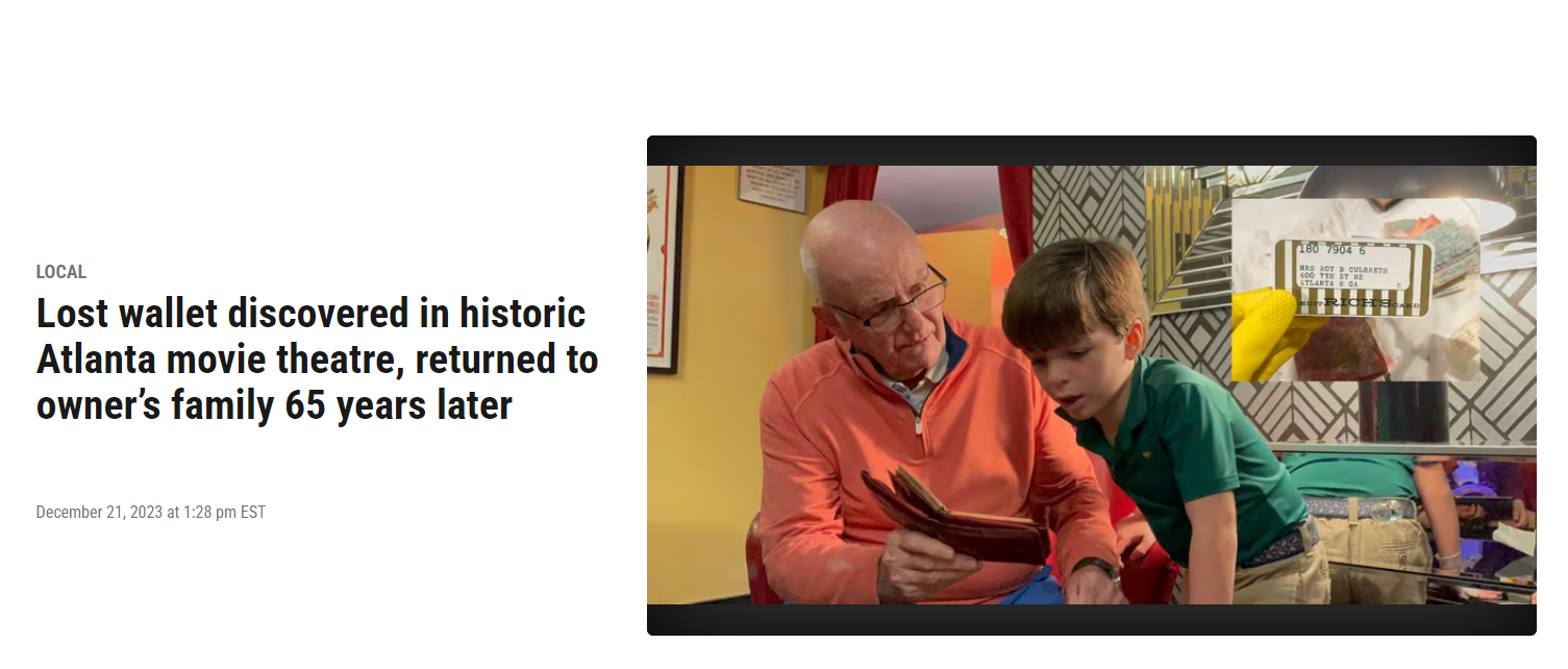 A misplaced wallet discovered in a historic Atlanta movie theatre was finally returned to the owner’s family — over half a century later.
