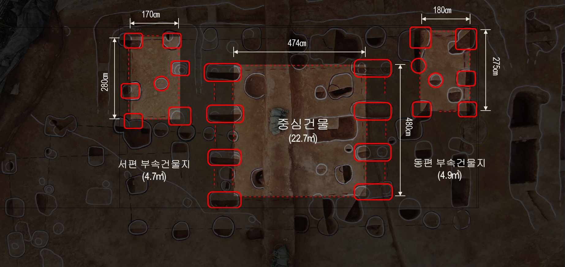 조사단에서는 조사구역 북쪽 중앙지점 젤 높은 곳에서 출현한 이 건물 흔적을 중시했거니와, 이에다가 힘을 주어 12미터 곱하기 7미터짜리 이 건물이 위격이 있었을 것이다. 이런 점을 강조하고 싶었을 것이다.