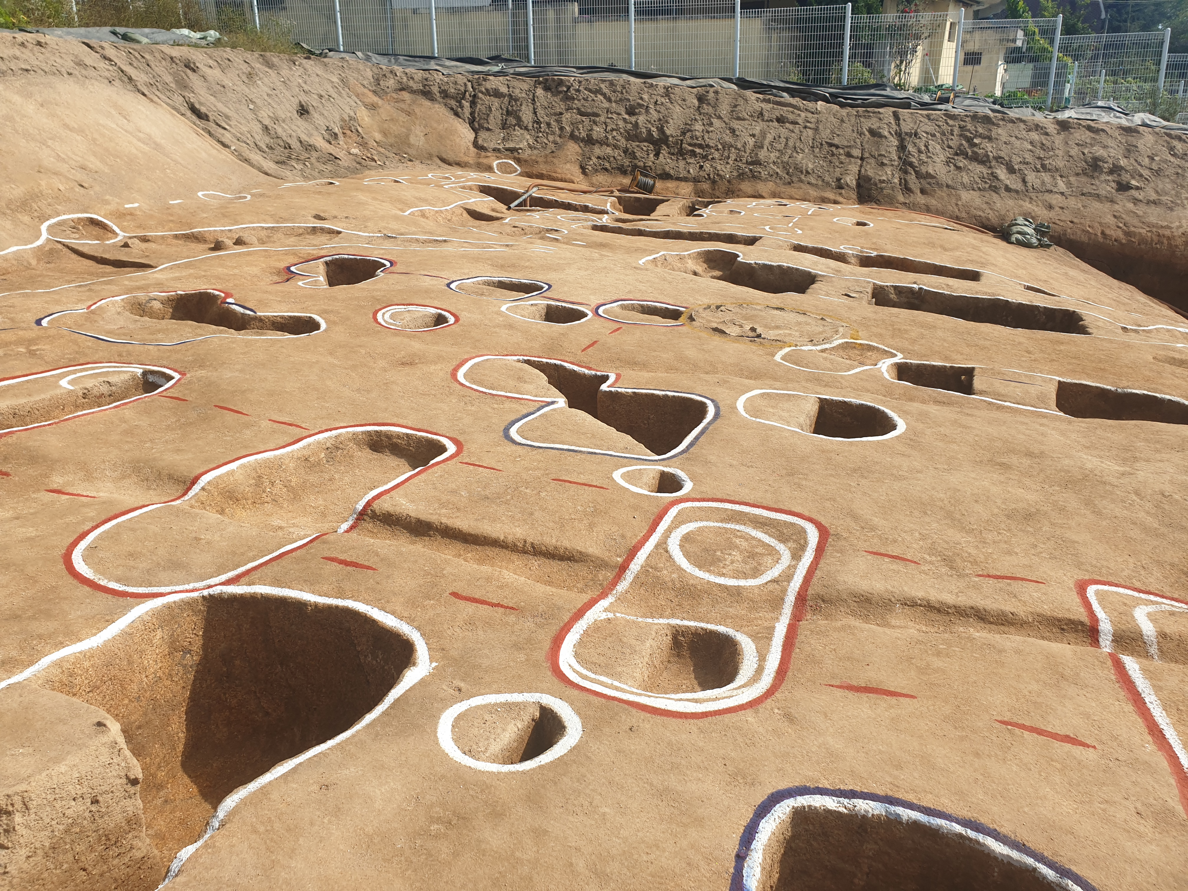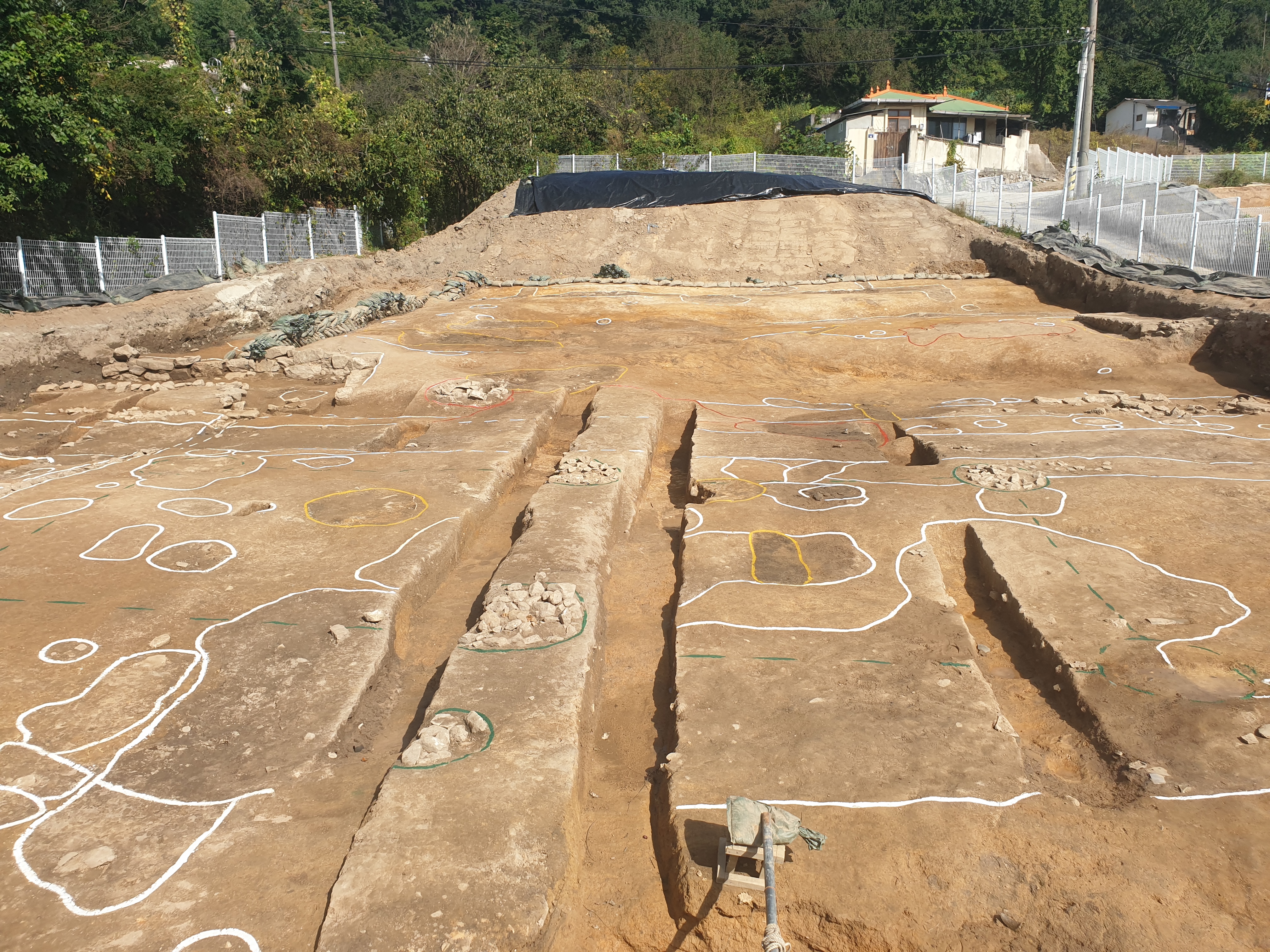 드러난 양상이 이렇다. 남북 방향으로 찍은 것인데, 위쪽이 부소산을 향하는 지점이라 더 높다. 이번에 드러난 흔적은 크게 그 북쪽 지점 건물과 그 아래쪽 조사구역을 동서방향으로 관통하는 회랑 혹은 도랑 같은 열라 긴 시설로 대별하거니와, 아래쪽 도랑 혹은 회랑이 직선으로 동서방향으로 이어진다는 점이 나로서는 매우 독특했다.
