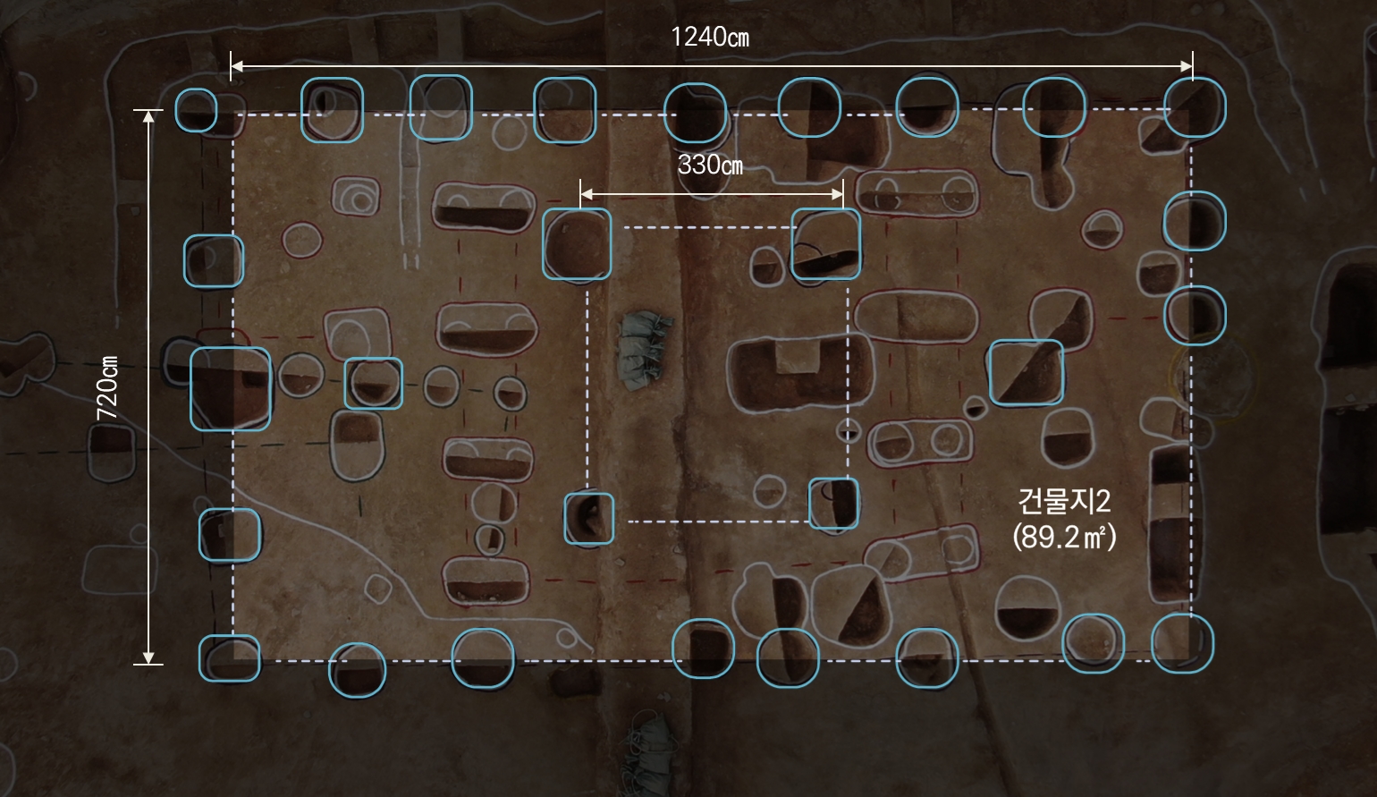 조사단에서는 조사구역 북쪽 중앙지점 젤 높은 곳에서 출현한 이 건물 흔적을 중시했거니와, 이에다가 힘을 주어 12미터 곱하기 7미터짜리 이 건물이 위격이 있었을 것이다. 이런 점을 강조하고 싶었을 것이다.