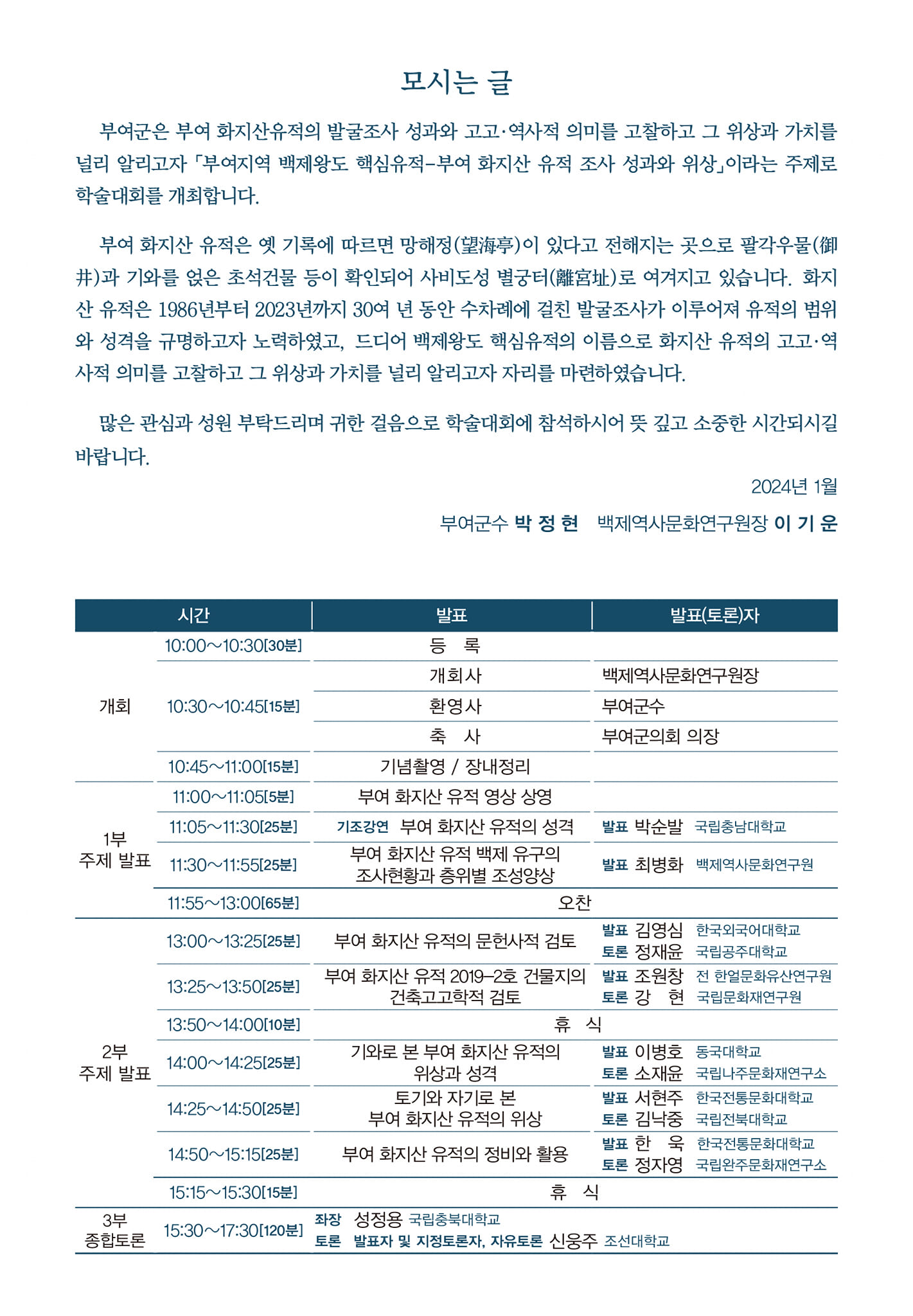 부여군과 백제역사문화연구원이 오는 1월 12일(금) 부여박물관 사비마루에서 화지산유적에 대한 학술대회를 개최합니다.
