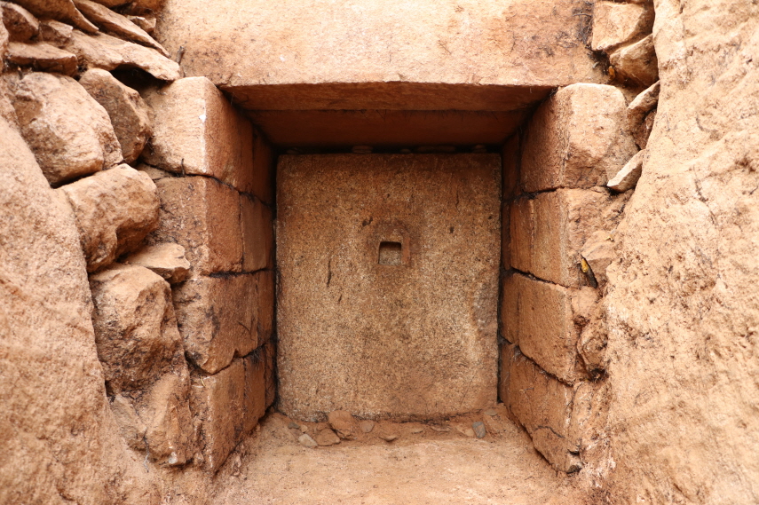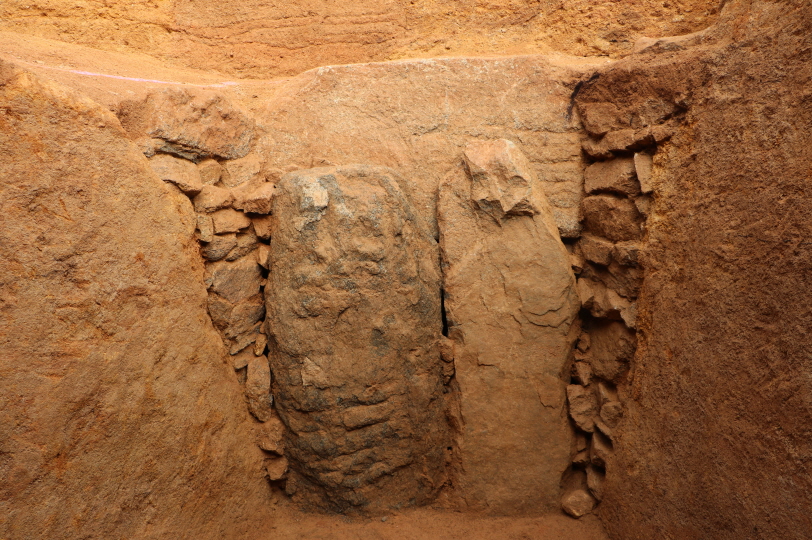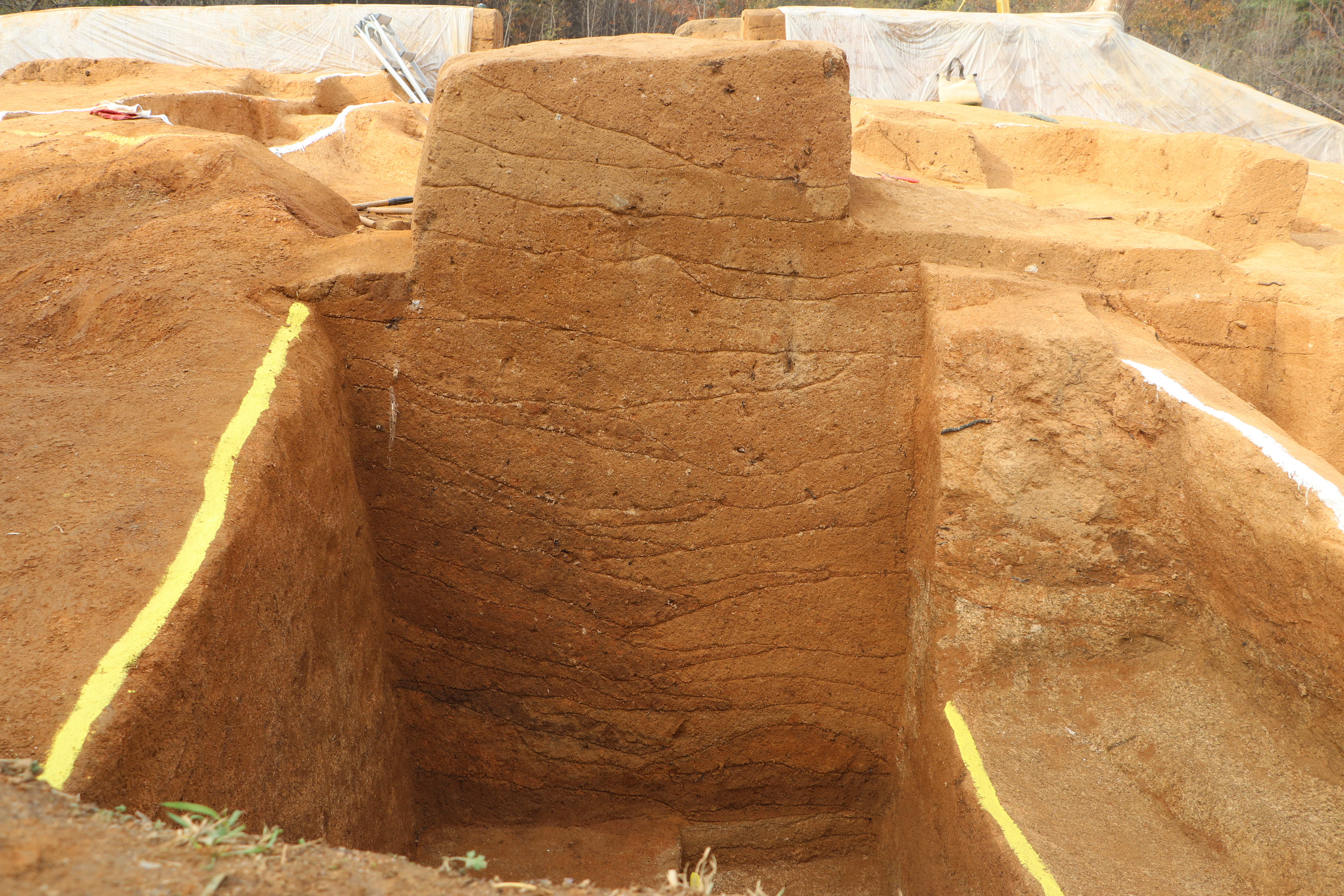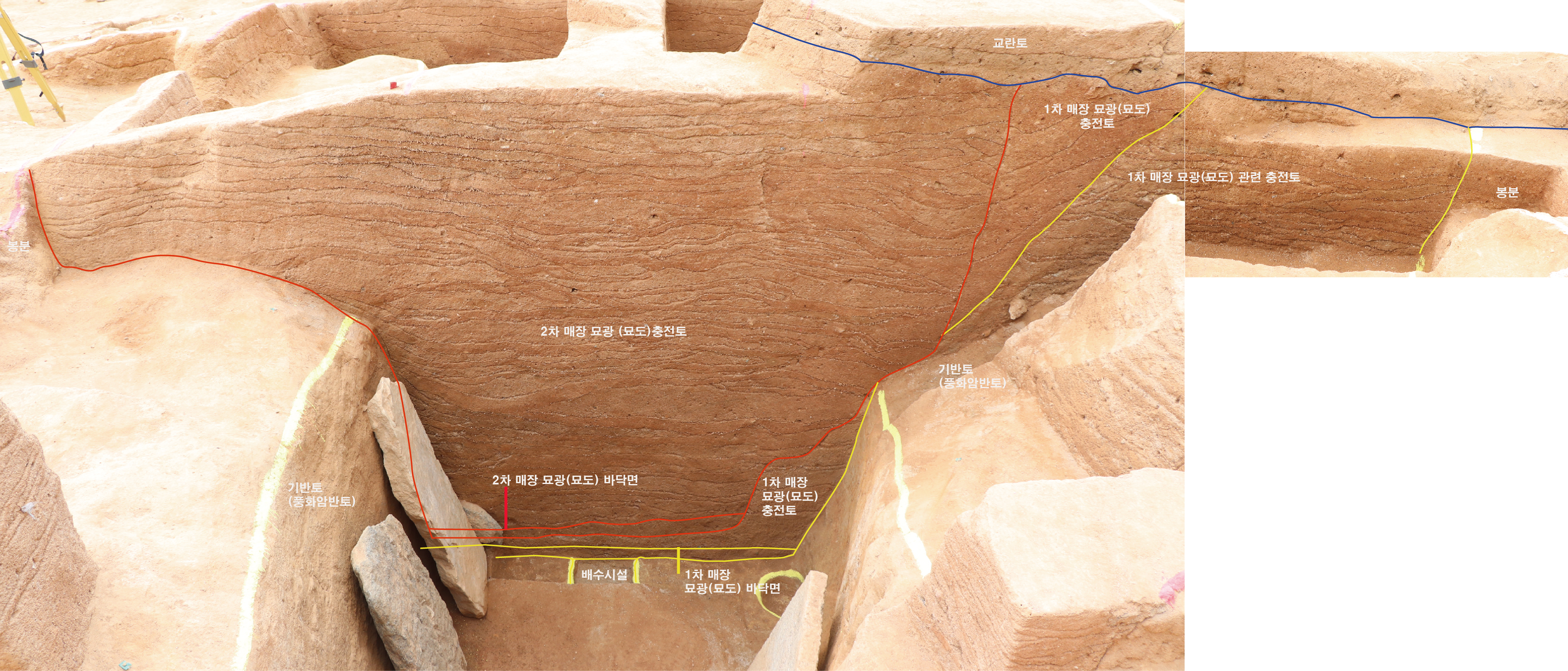 봉분 외곽에서는 경계석과 함께 2단 석축시설도 확인되어 고분 남쪽의 봉분과 묘도, 석축시설과 하부 정지층과의 관계를 파악하기 위해 탐색시굴갱을 설치하여 조사를 진행하였다.