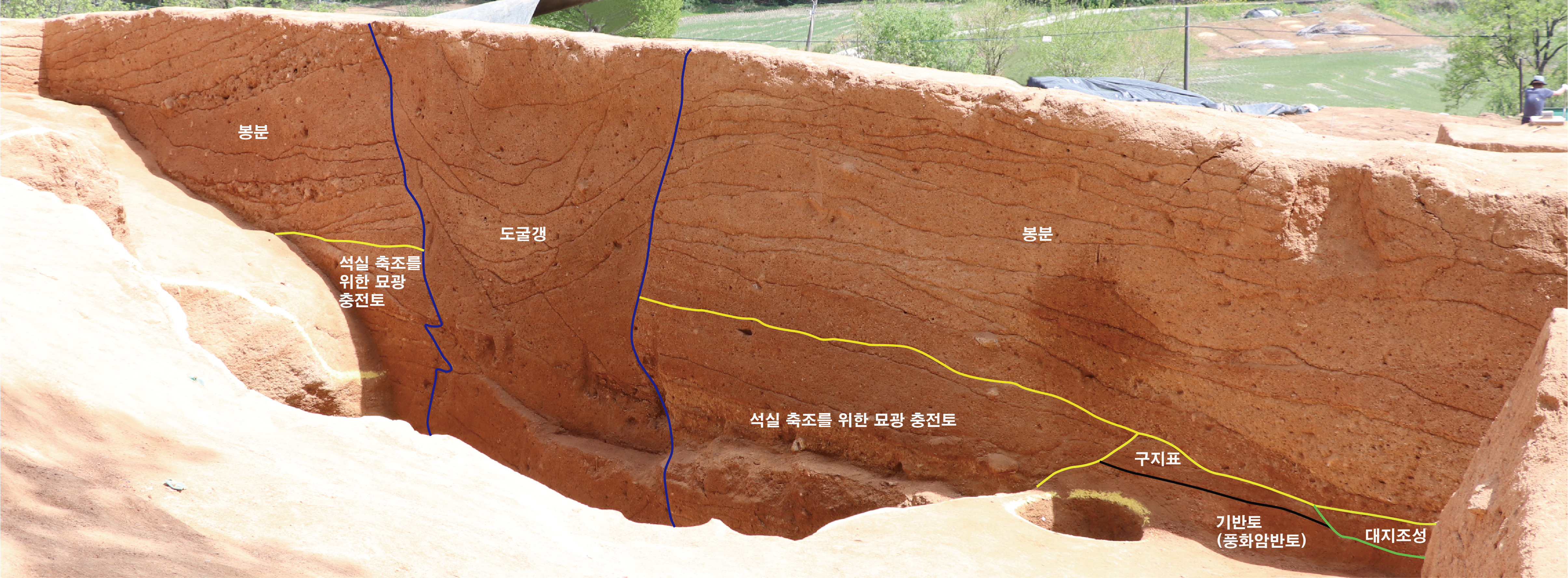 묘광 중 현실과 연도, 묘도 일부는 봉분 조성 전에 구지표나 기반토인 적갈색점질토와 풍화암반토를 수직에 가깝게 파내려갔으며, 묘도쪽은 봉분 조성 후 봉분에서부터 경사지게 내려가다가 하부에서 수직에 가깝게 파내려갔다.