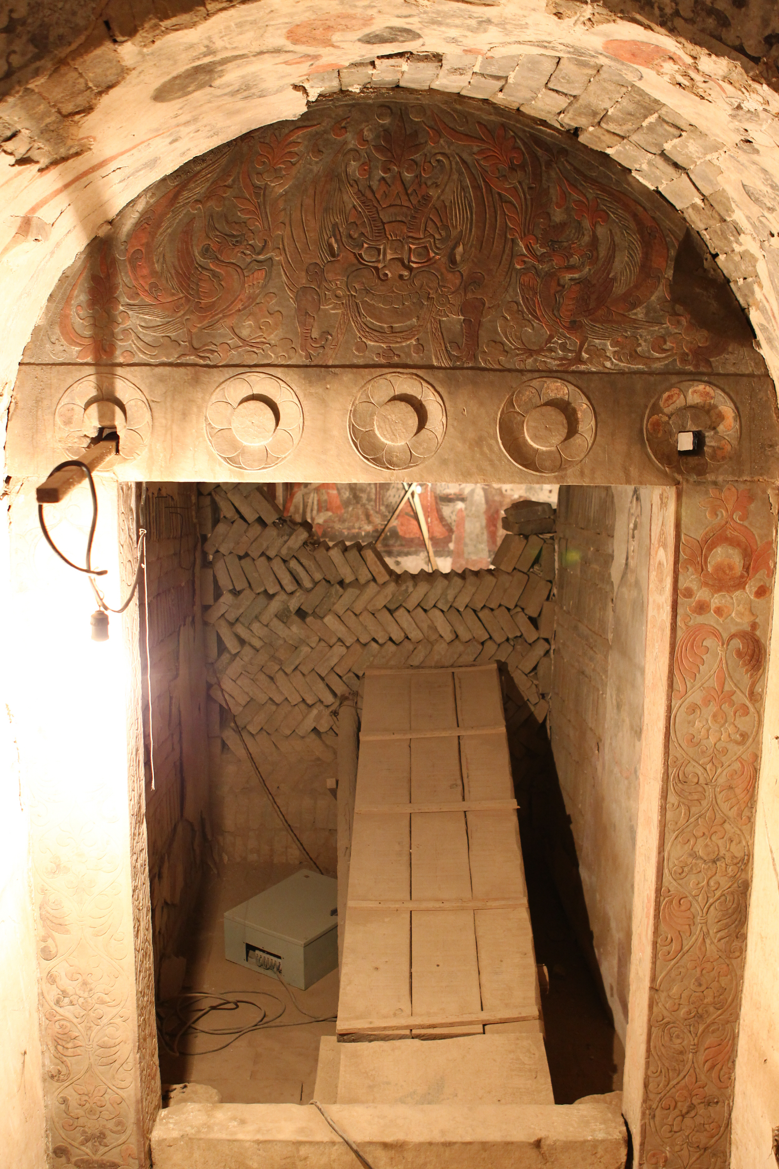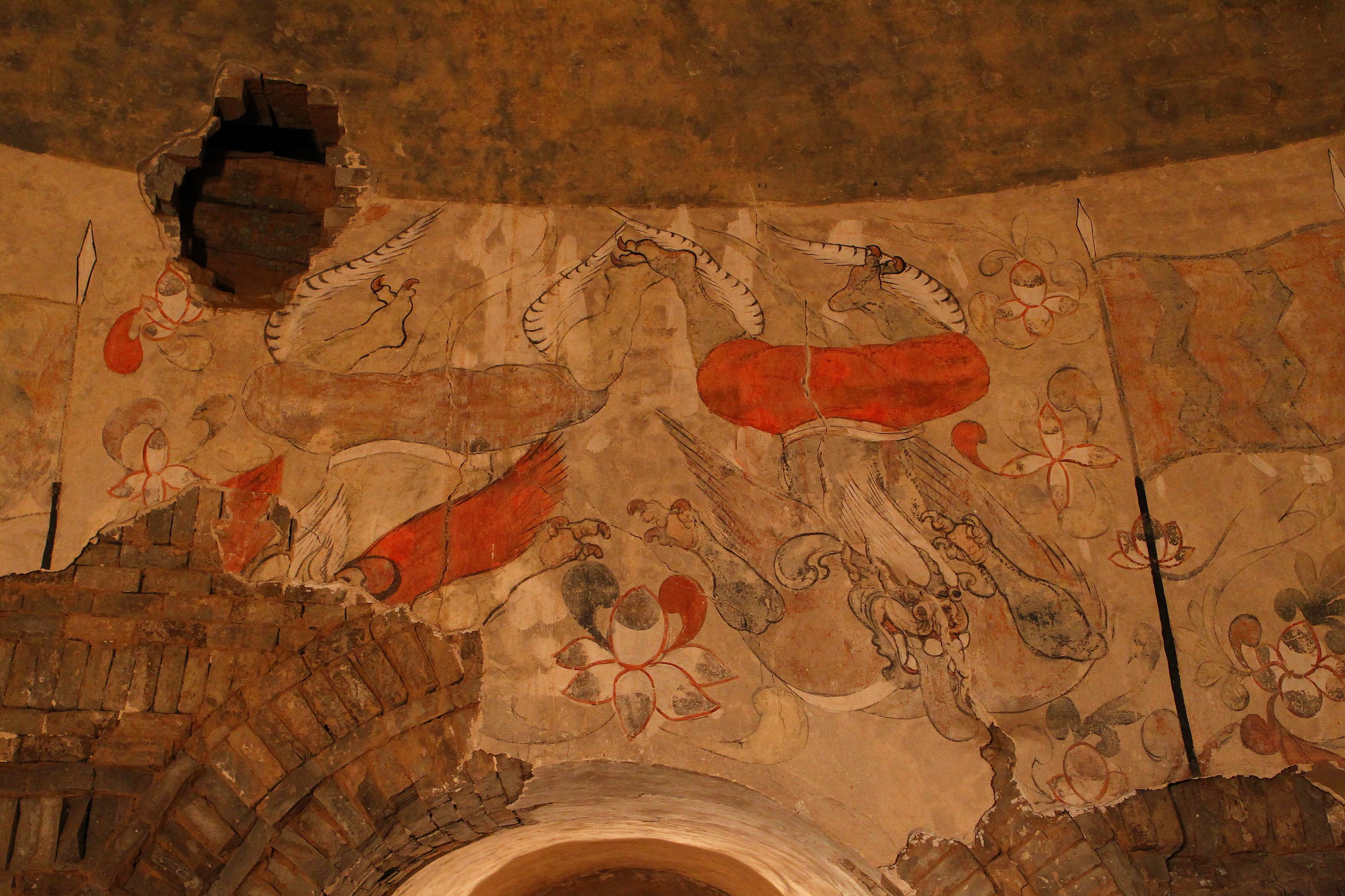 대문 위 아치형 부분에는 붉은색이 완연한 귀면(鬼面) 같은 그림을 중심으로 그 양쪽에는 피닉스 같은 사나운 새가 보인다. 이 귀면은 아무래도 용을 형상화한 듯하며, 양쪽 피닉스는 봉황, 혹은 주작인 듯했다. 이른바 용과 봉황을함께 표현한 용봉(龍鳳)화인 것이다. 용봉은 '무덤에 들어오지 말라, 들어오면 다친다'는 경고를 하는 것만 같았다.