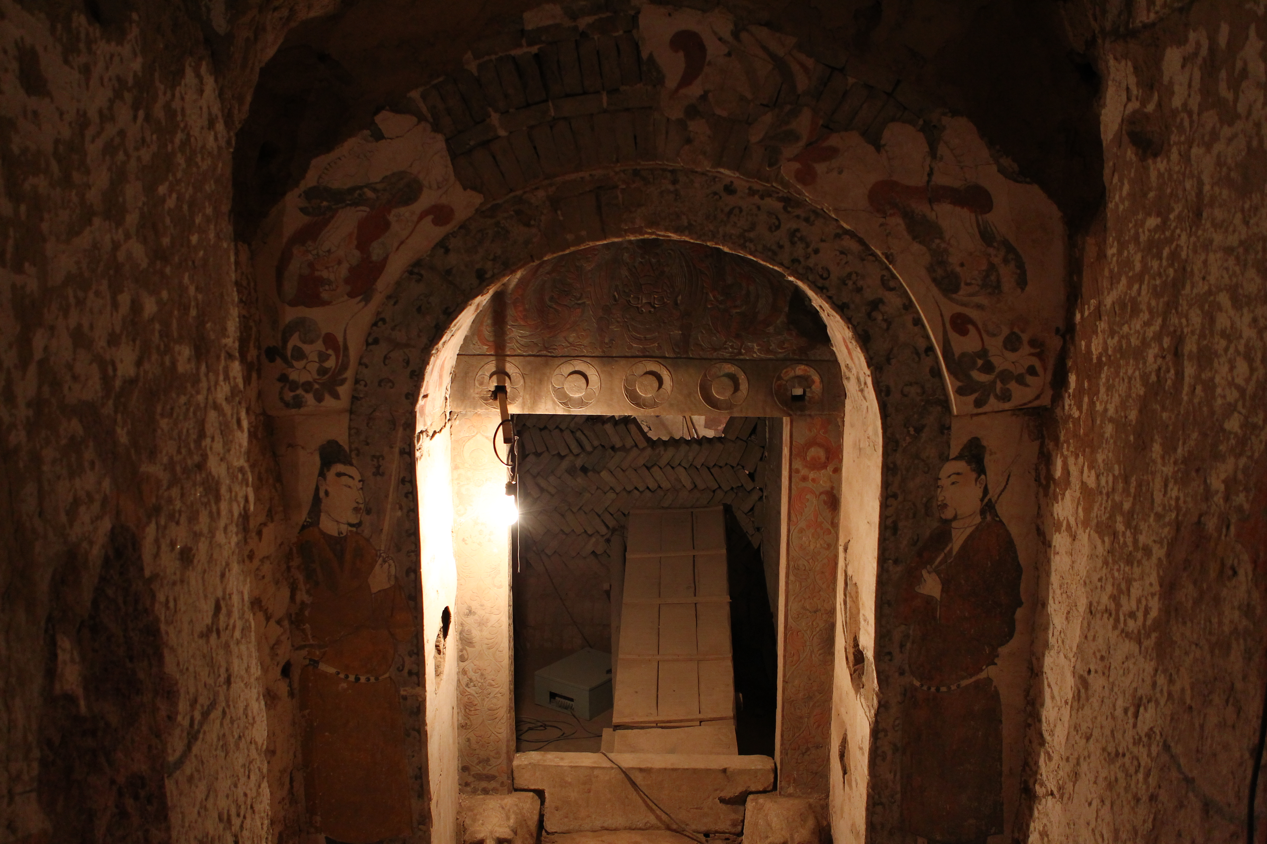 벽화는 그 선명함이 우선 놀랍다. 묘도가 끝나고 묘실로 들어가는 길목엔 아치형 대문이 나타난다. 이곳부터 온통 벽돌 구조물이다. 대문 양쪽엔 채찍으로 보이는 물건을 든 인물 그림이 또렷하다. 문을 지키는 관리인 문리(門吏)일 것이다. 고구려 벽화고분 중 안악3호분에서 보이는 문지기인 장하독(帳下督) 정도에 해당할 듯하다.
