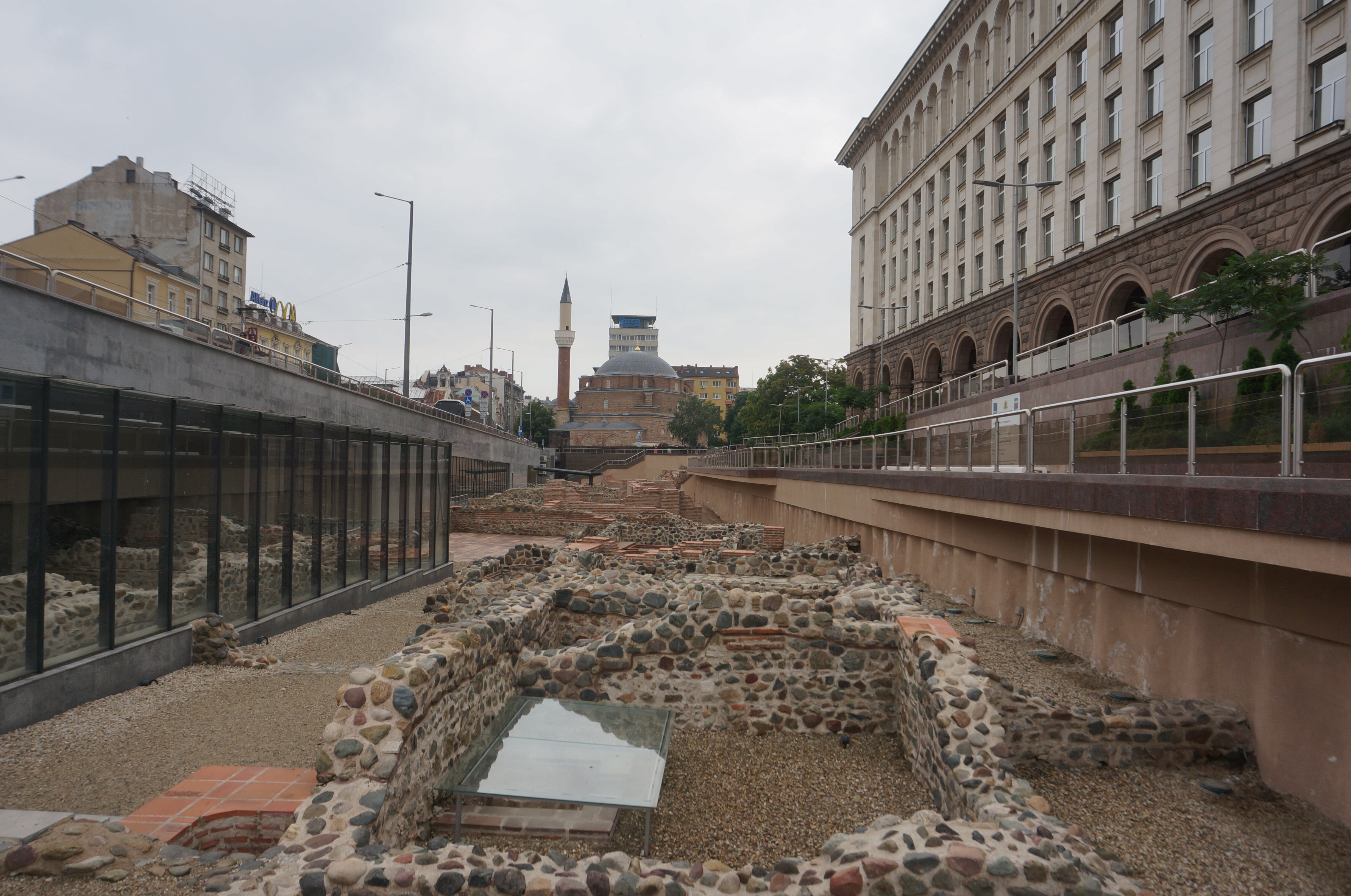 왼쪽은 지하철 역, 가운데 로마시대 유구, 그 너머의 모스크, 오른쪽은 예전 공산당 본부였지만 지금은 호텔과 대통령궁으로 쓰이는 건물이다.