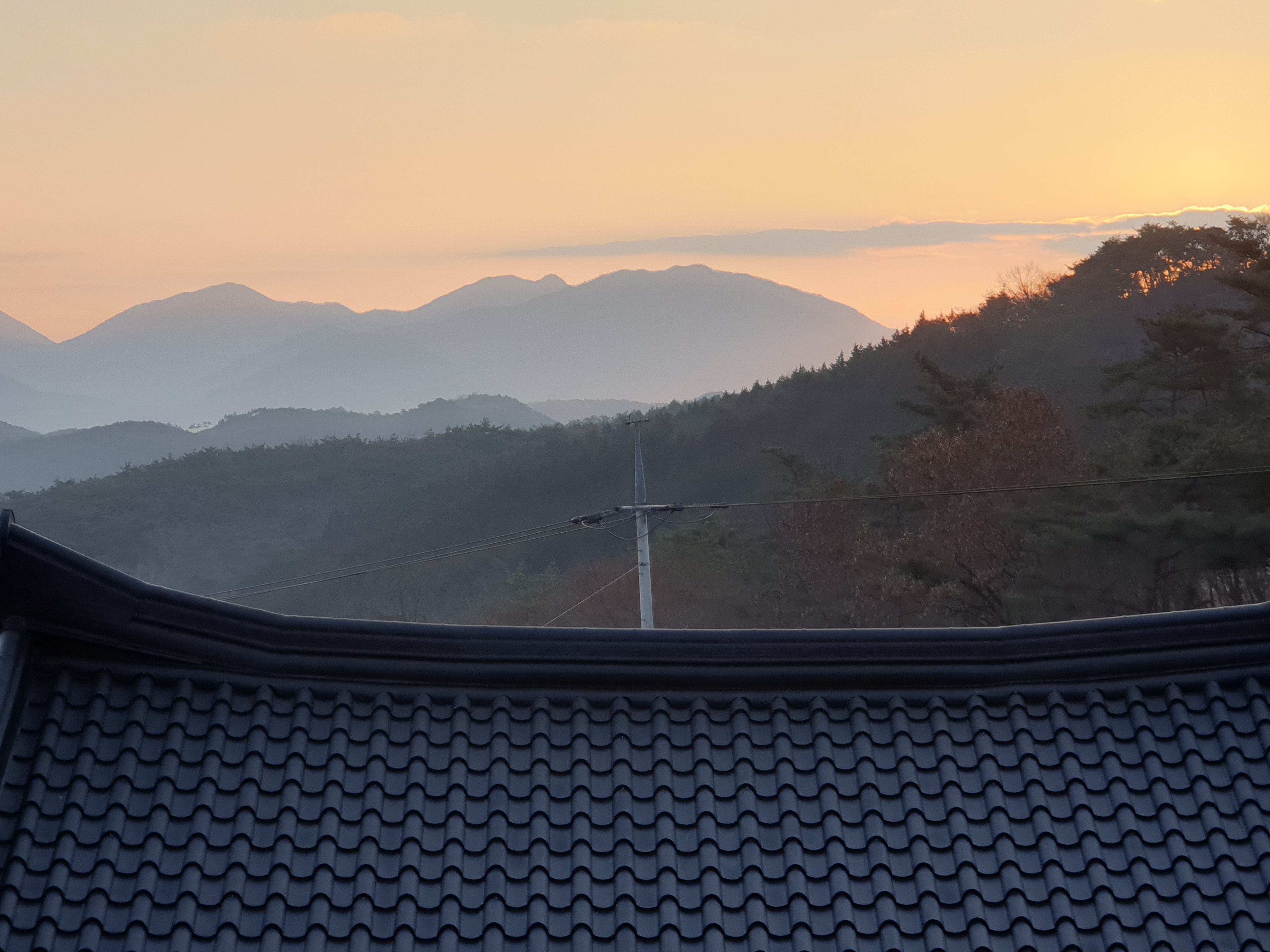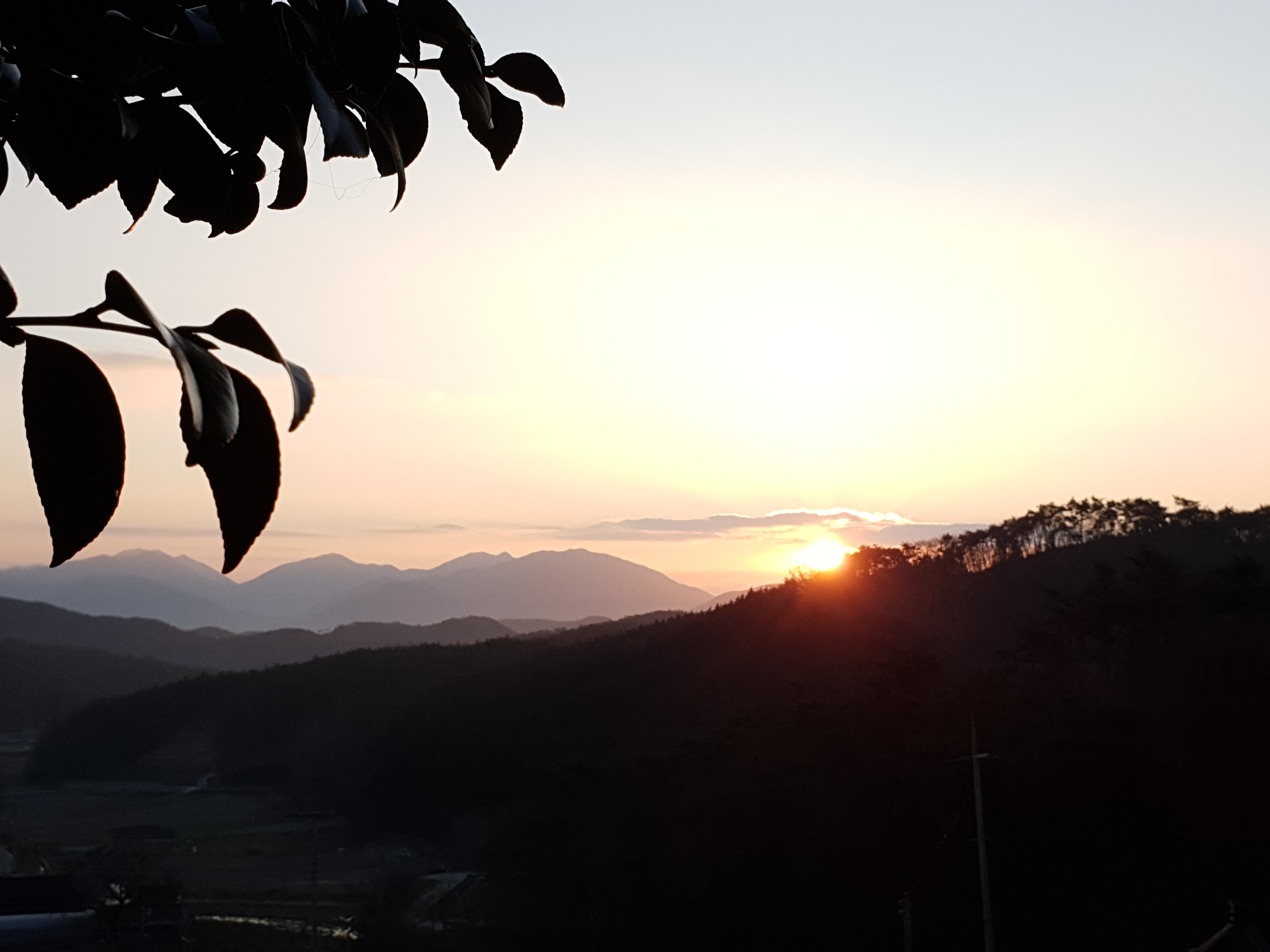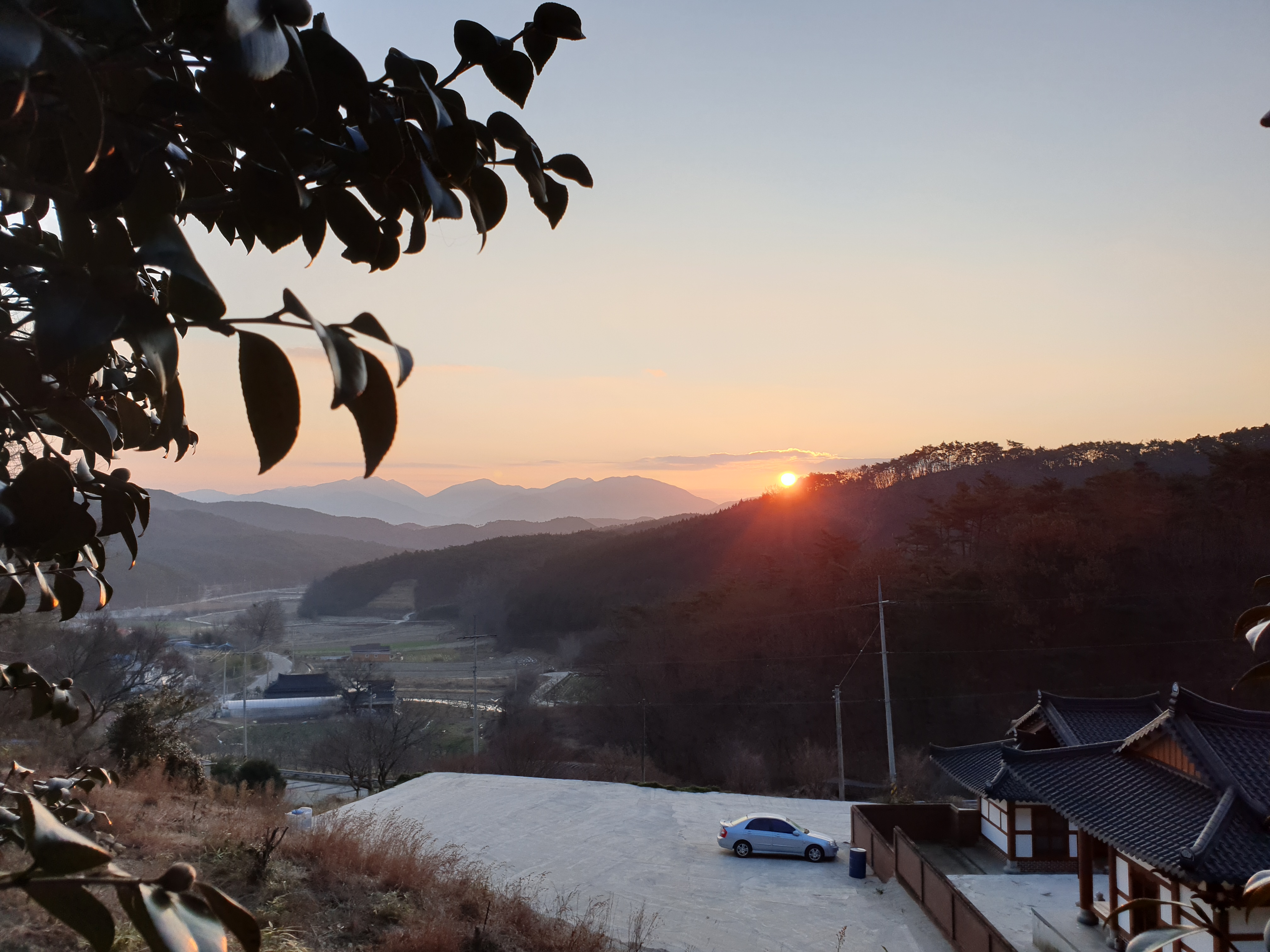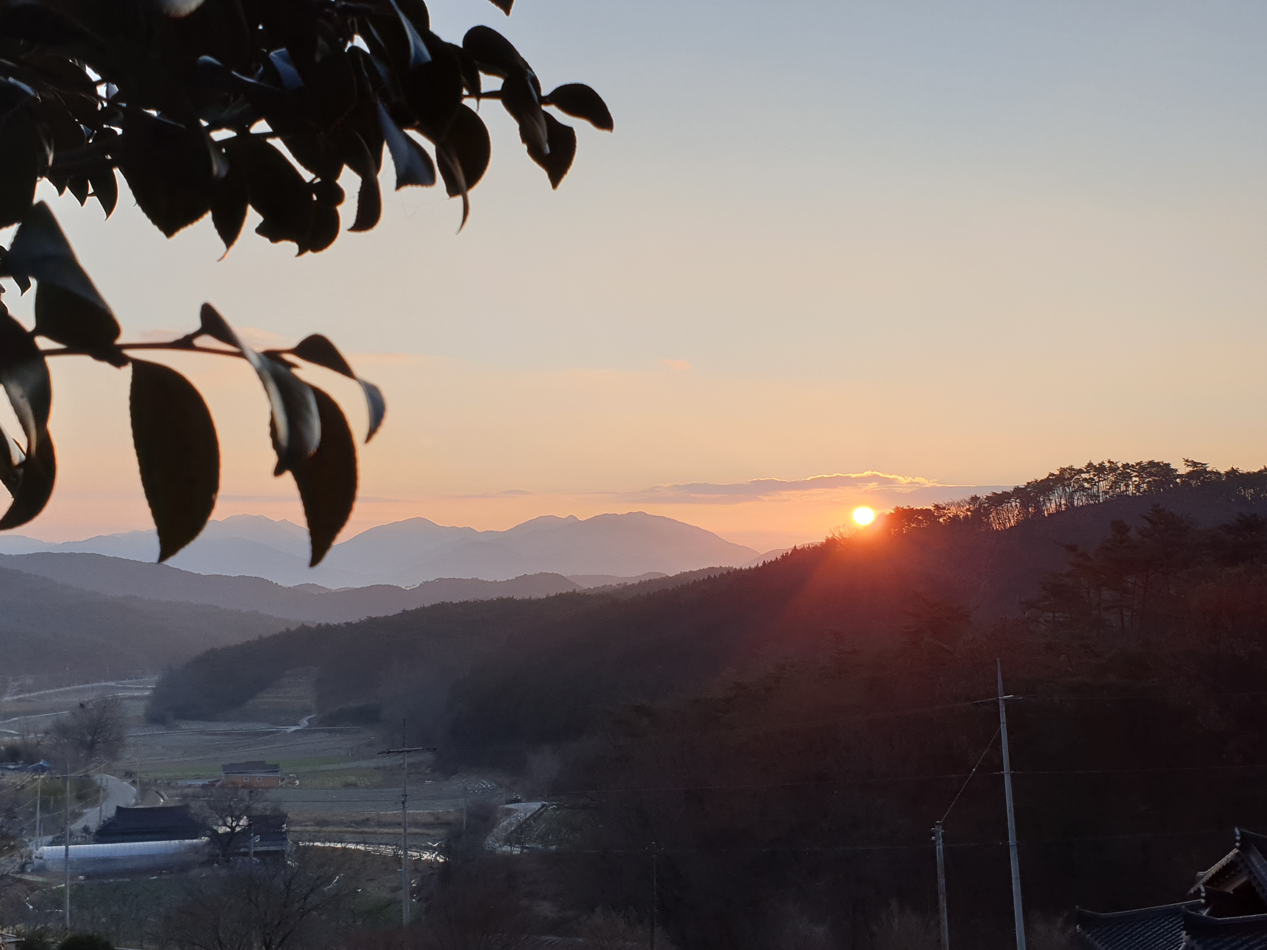 하남정사 동산 우흐로 해가 고개를 들이민다.
