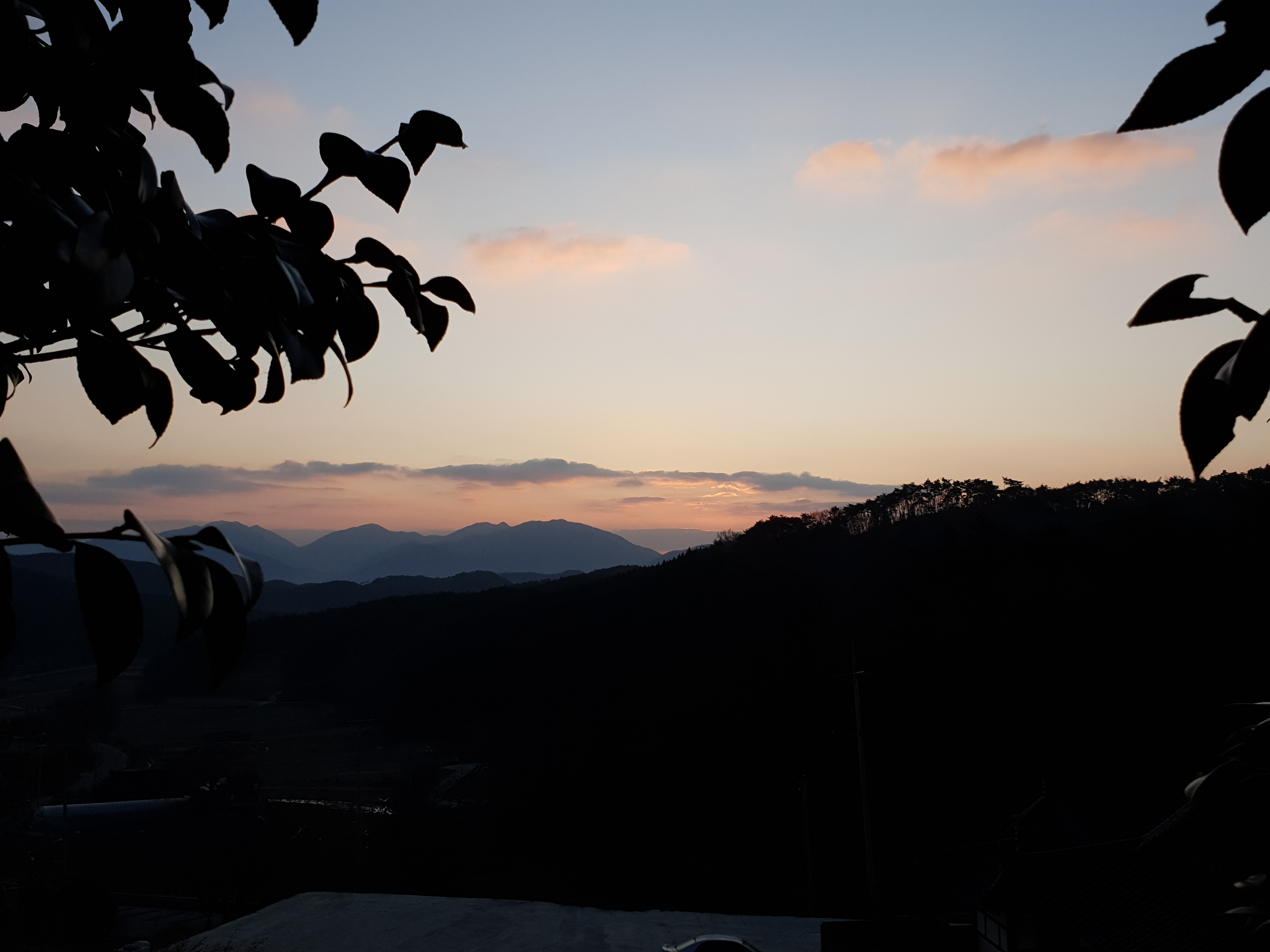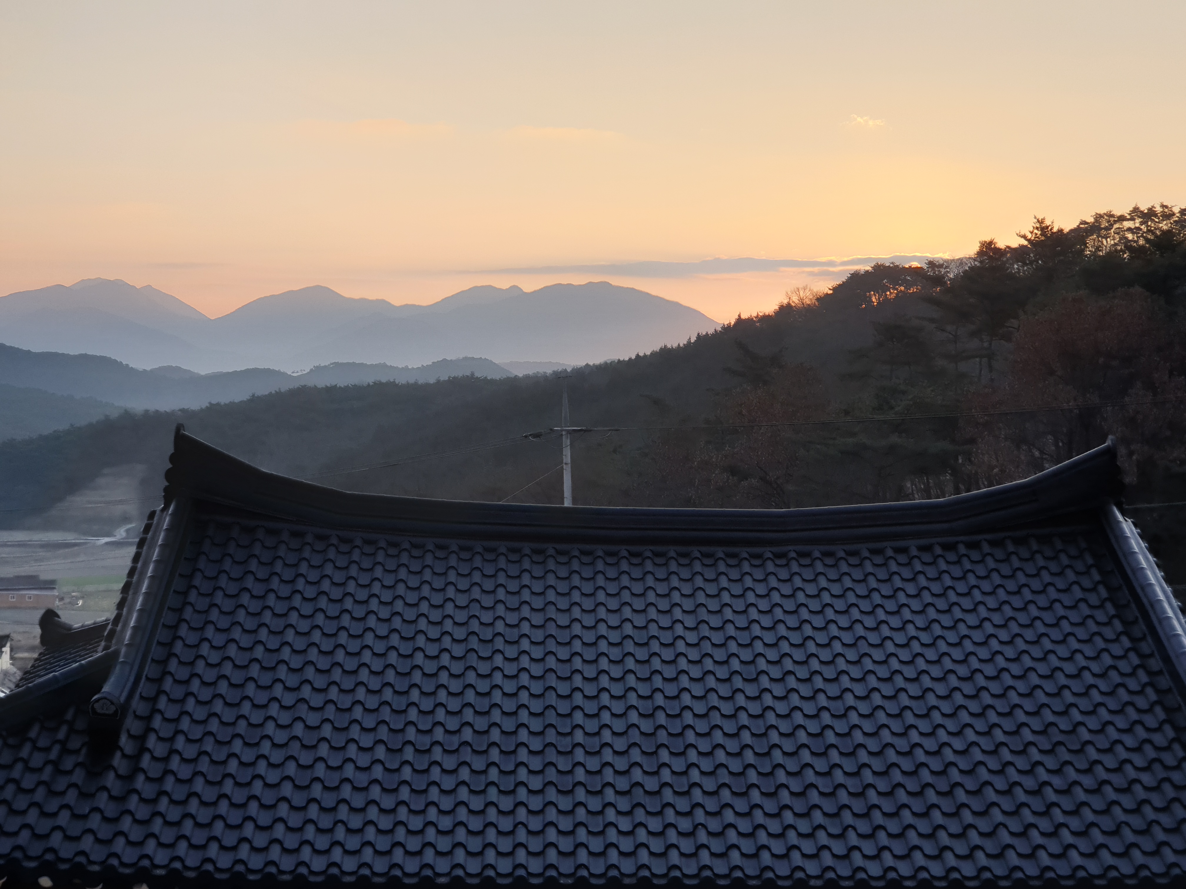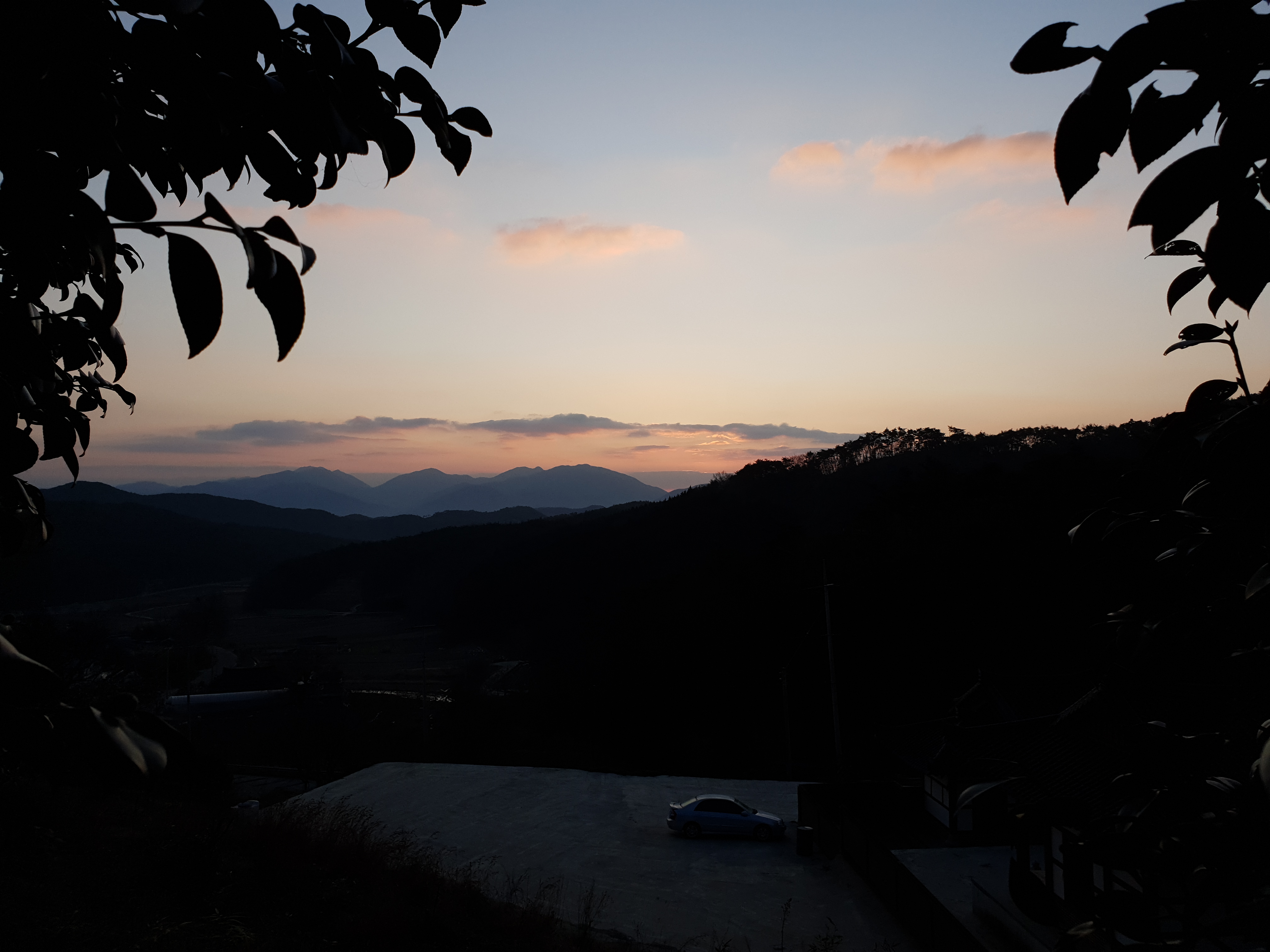 하남정사 동산 우흐로 해가 고개를 들이민다.