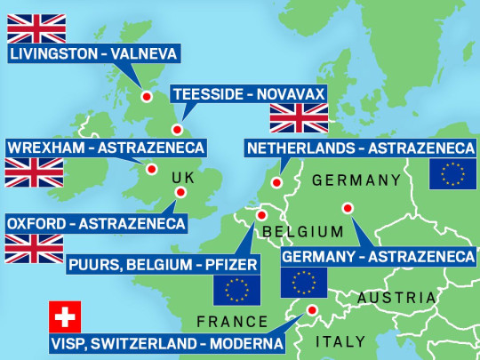 EU와 영국에 소재하는 백신공장 분포현황이다. 지명과 그에서 백신을 생산하는 업체 이름을 나열했다. 이 지도를 봐야 지금 EU와 영국간에 벌어지는 백신전쟁을 이해하는 단초를 마련한다. 덧붙여 하필 영국이 근자 EU를 탈퇴해 독자노선을 걷기 시작한 점도 이번 분쟁을 이해하는 또 다른 관건이다.