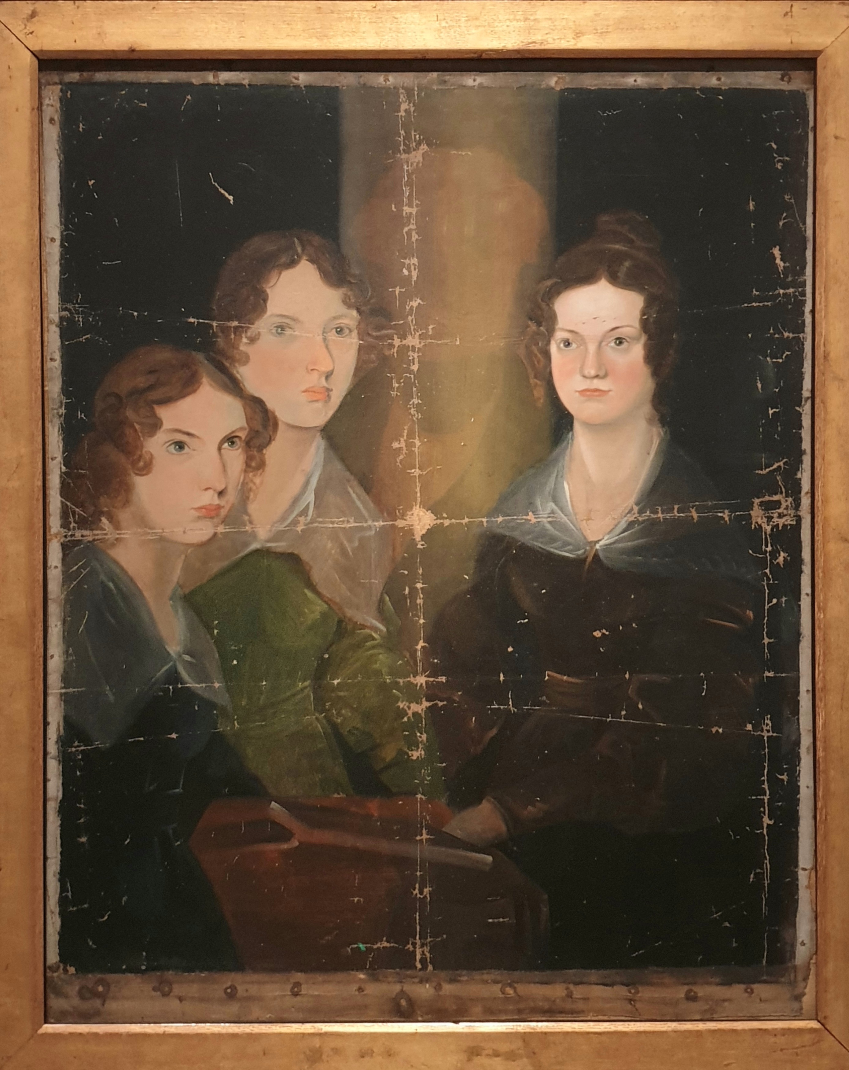 19세기에는 여성 소설가로 활동하는 것에 제약이 있었기 때문에 (세 자매는 각각) 액턴 Acton, 엘리스 Ellis, 커러 벨 Currer Bell이라는 필명을 사용했다. 자매를 그린 그림 중 유일하게 남은 것이다. 자매의 남자 동기였던 브란웰이 화가를 꿈꾸던 17세 때 그렸다. 그림 뒤편에 희미하게 보이는 형상이 그였을 것으로 추정된다. 이 그림은 오랫동안 잃어버렸던 것으로 여겨졌다가 1914년 찬장에서 접힌 채로 발견되었다. 초상화미술관은 그림이 오랫동안 방치되었다는 것을 보여주기 위해서 접히고 물감이 떨어진 부분을 그대로 보존했다.