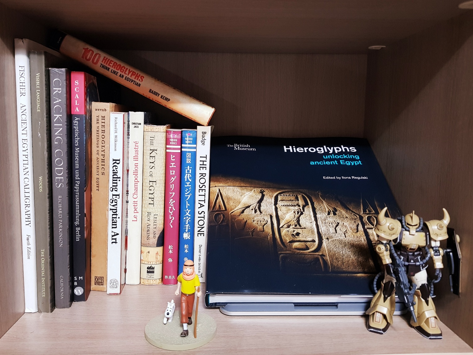 도록과 함께 제가 소장한 이집트 상형문자에 관한 책들을 함께 배치해 보았습니다. 저는 각각의 상형문자가 지닌 고유한 기원과 역사, 그리고 다양한 의미와 기능에도 많은 흥미와 관심이 있습니다. 제가 이집트학을 공부하게 된 동기 중 하나도 상형문자의 아름다움이었으니까요.