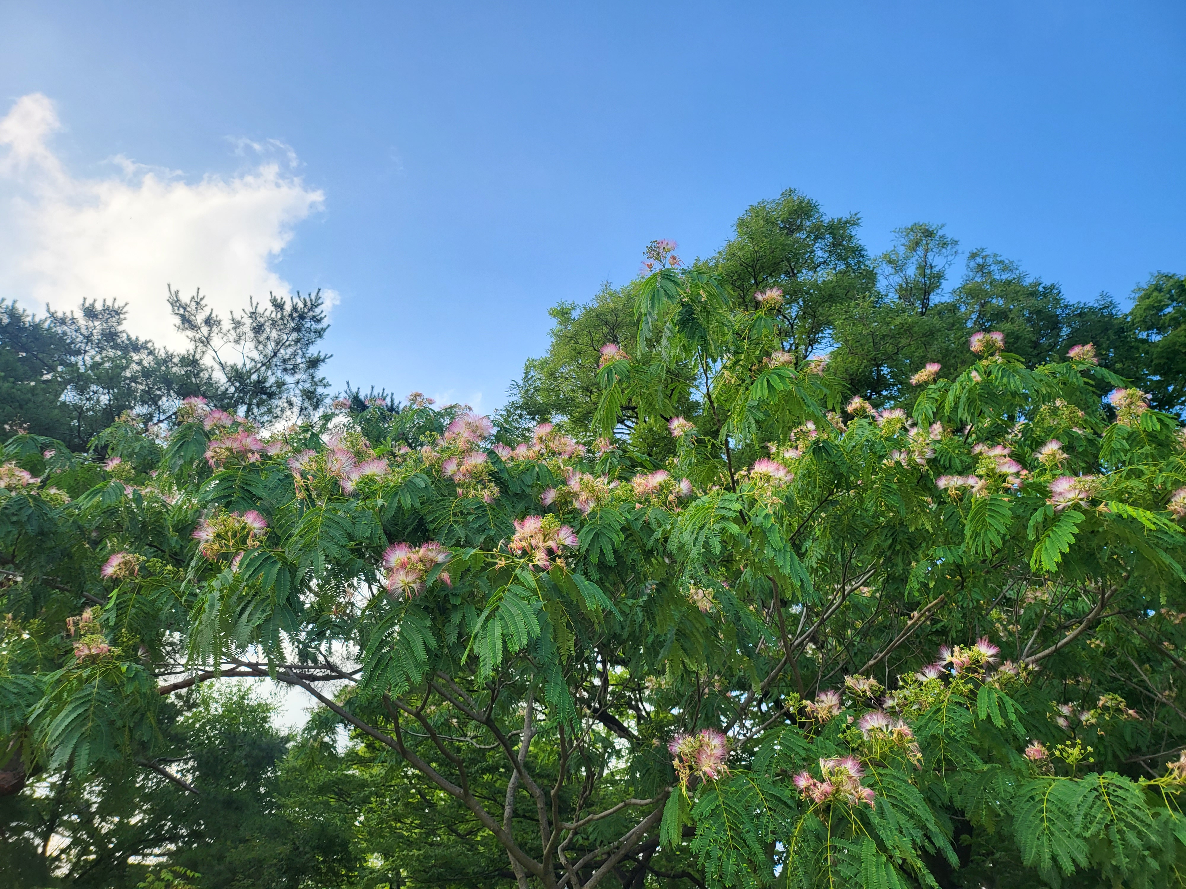 서울에서는 자귀나무라 한다는 이 친구는 보다시피 이 무렵 저 화려찬란한 꽃을 피우곤 하거니와, 우리 동네 산에서는 흔한 수종이었으니, 요새는 저 꽃이 아름답다 해서 관상용으로 쓰는 일이 많은 것이 아닌가 한다.