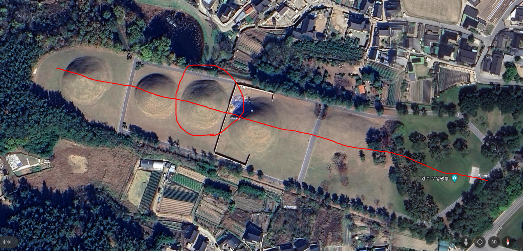 이 서악고분분 배치 양상을 보면 유독 저 비집고 들어간 것만 제외하고는 앞쪽 태종무열왕릉까지 정확히 일직선을 이룬다.