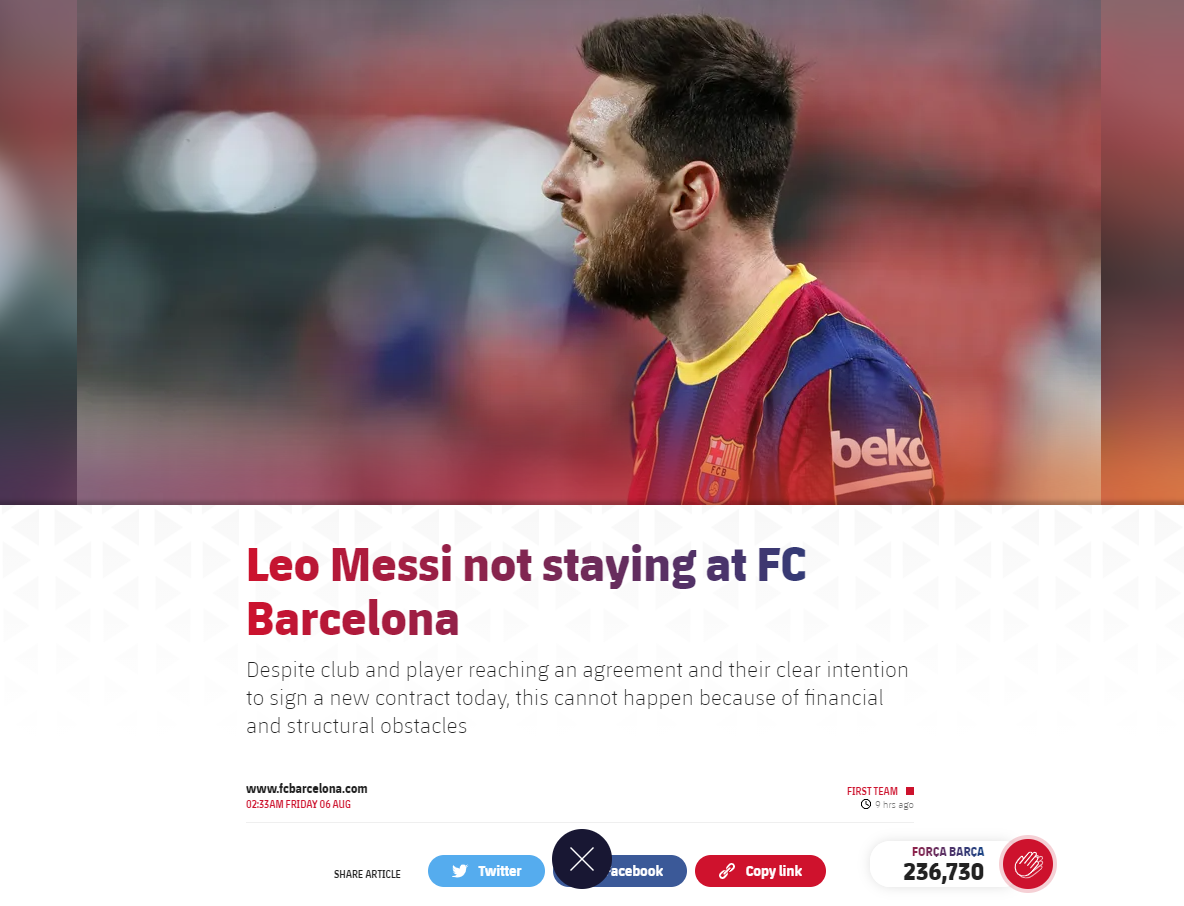 이태전, 메시는 이적하겠다는 의사를 팩스로 구단에 전달하면서 세계 축구계를 흔들었다. 계약기간 1년이 남은 시점에서, 마침 감독이 경질되고 쿠만 감독이 새로 부임했지만, 이 새 감독이 조금은 리오넬 메시의 심기를 건드린 모양이라, 이런저런 알력이 흘러나오다가 마침내 그가 공식으로 이적을 요청했다는 소식이 공식화하기에 이르렀다.