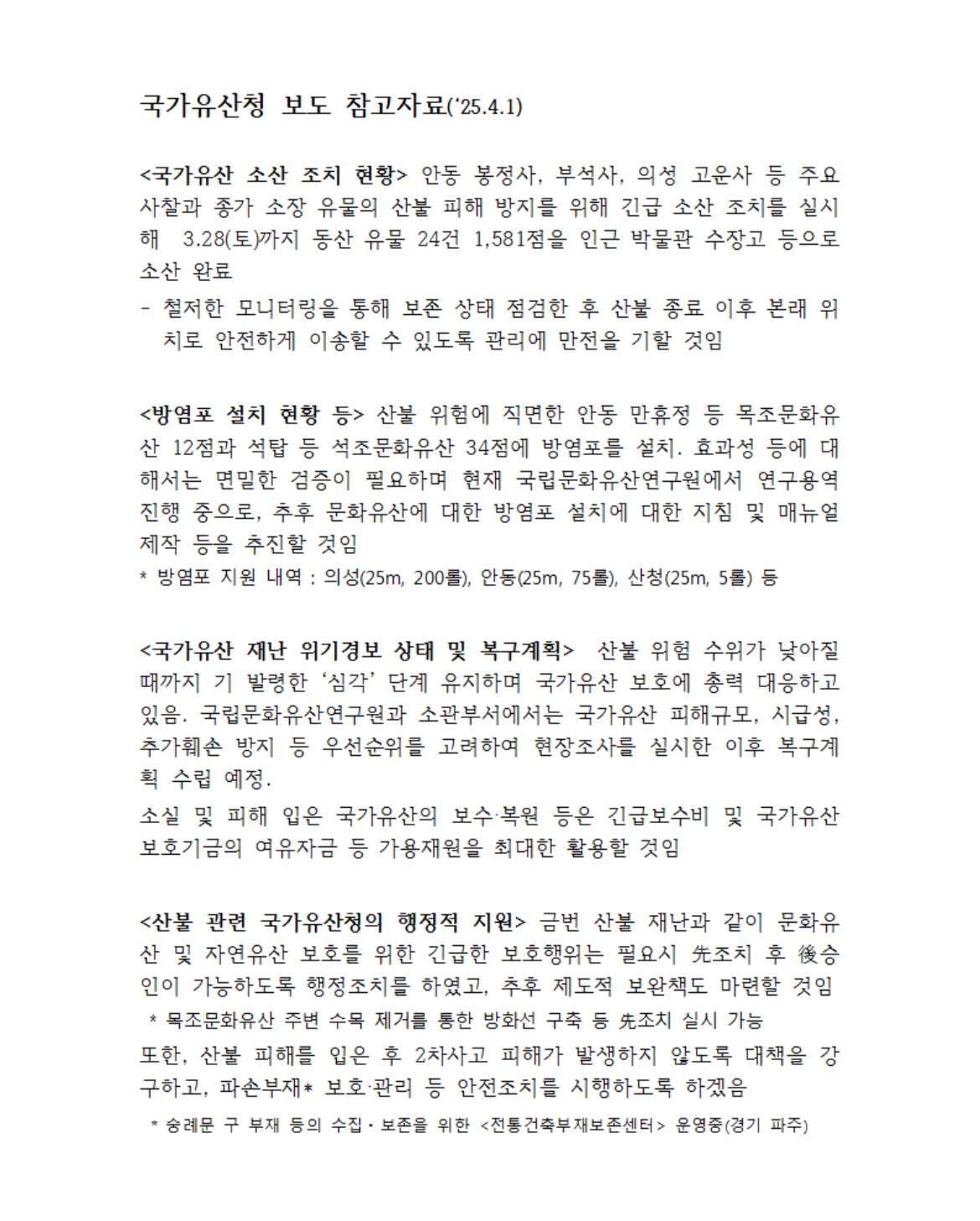 (서울=연합뉴스) 김예나 기자 = 영남권을 휩쓴 대형 산불로 인한 국가유산(옛 '문화재') 피해가 속속 확인되고 있다.