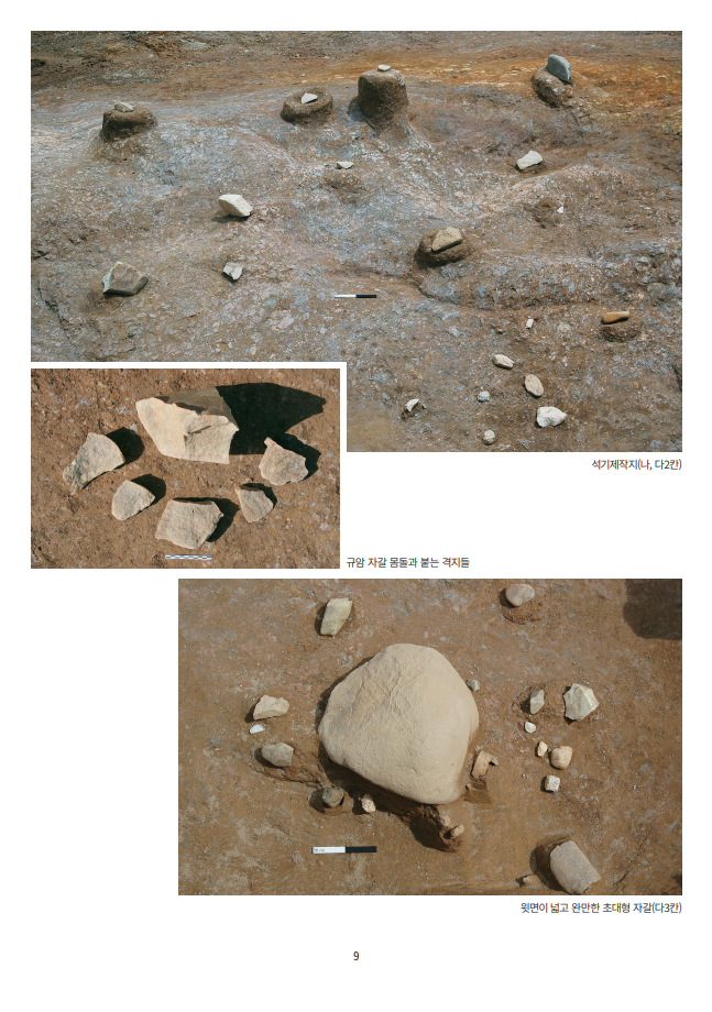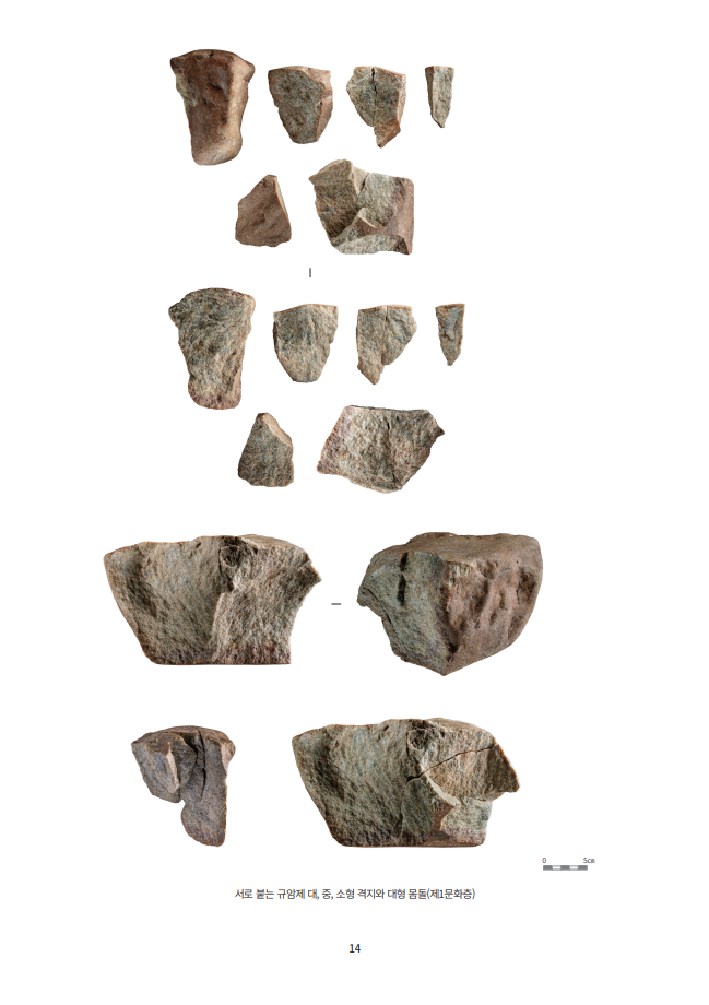 4. 각각 1천546점과 1천283점 유물이 각각 출토된 제1문화층과 제2문화층의 석기갖춤새는 몸돌, 격지, 조각돌, 부스러기처럼 버리는 것이 80% 내외인 점과 더불어 다수의 돌망치, 모룻돌과 같은 연장의 존재, 그리고 다양한 붙는 석기의 사례는 유적이 살림터이자 석기제작소였음을 알려준다.