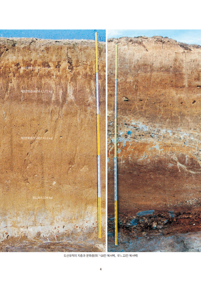 1. 마지막 간빙기 이후 쌓인 약 5m 두터운 퇴적층에 4개 구석기문화층이 차례로 남았으며, 이는 약 7~3만 년 전에 속하는 문화층으로 판단한다.