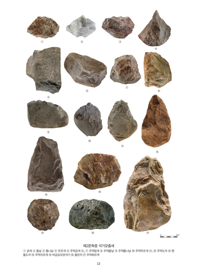 5. 제1·2문화층은 주먹도끼, 주먹찌르개, 주먹자르개, 찍개, 여러면석기 등으로 대표하는 이른바 주먹도끼석기군과 더불어 지금껏 보고되지 않은 새로운 종류인 주먹긁개, 주먹밀개, 주먹홈날, 주먹톱니날, 주먹뚜르개가 주류를 이룬다. 즉, 기존에 주로 격지나 조각돌을 몸체로 삼아 만든 잔손질석기(격지석기)의 몸체가 자갈돌인 경우가 상당수 존재하여 기존의 양상과는 구별되는데, 이는 무게가 5kg이 넘는 초대형 주먹찌르개(보고서 뒤표지의 석기)와 대형 몸돌, 그리고 대형 격지로 만든 1kg 내외의 주먹자르개, 3kg이 넘는 초대형 돌망치의 출토 사례와 함께 유적 성격을 잘 대변한다.