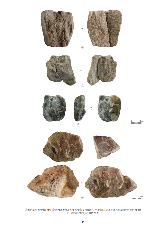 4. 각각 1천546점과 1천283점 유물이 각각 출토된 제1문화층과 제2문화층의 석기갖춤새는 몸돌, 격지, 조각돌, 부스러기처럼 버리는 것이 80% 내외인 점과 더불어 다수의 돌망치, 모룻돌과 같은 연장의 존재, 그리고 다양한 붙는 석기의 사례는 유적이 살림터이자 석기제작소였음을 알려준다.