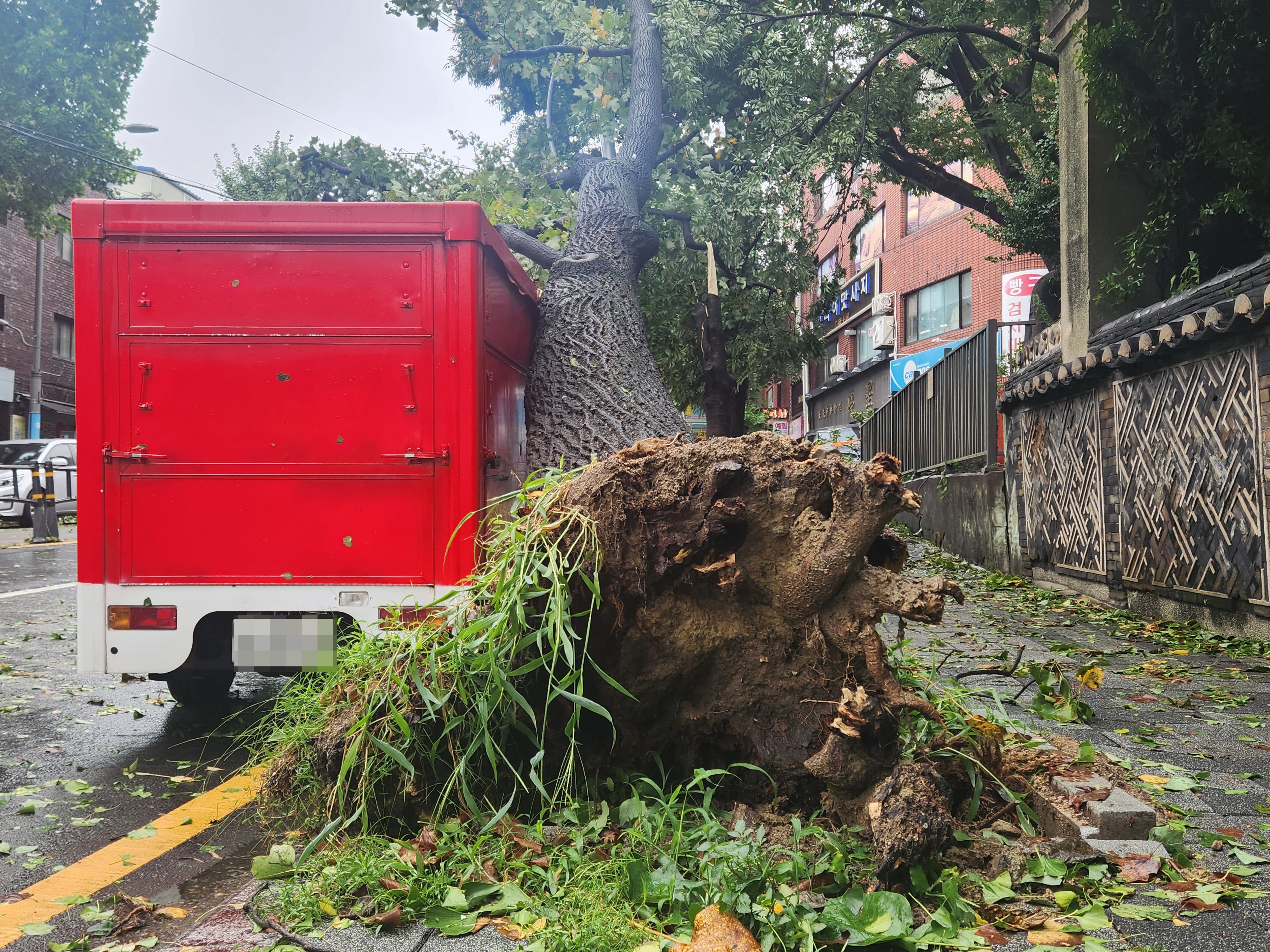 태풍 카눈에 맛탱이 가신 이 가로수님, 보아 하니 뿌리가 아주 얕아 한방에 가셨다. 이건 재기 불능이라 불쏘시개로 가야 한다.