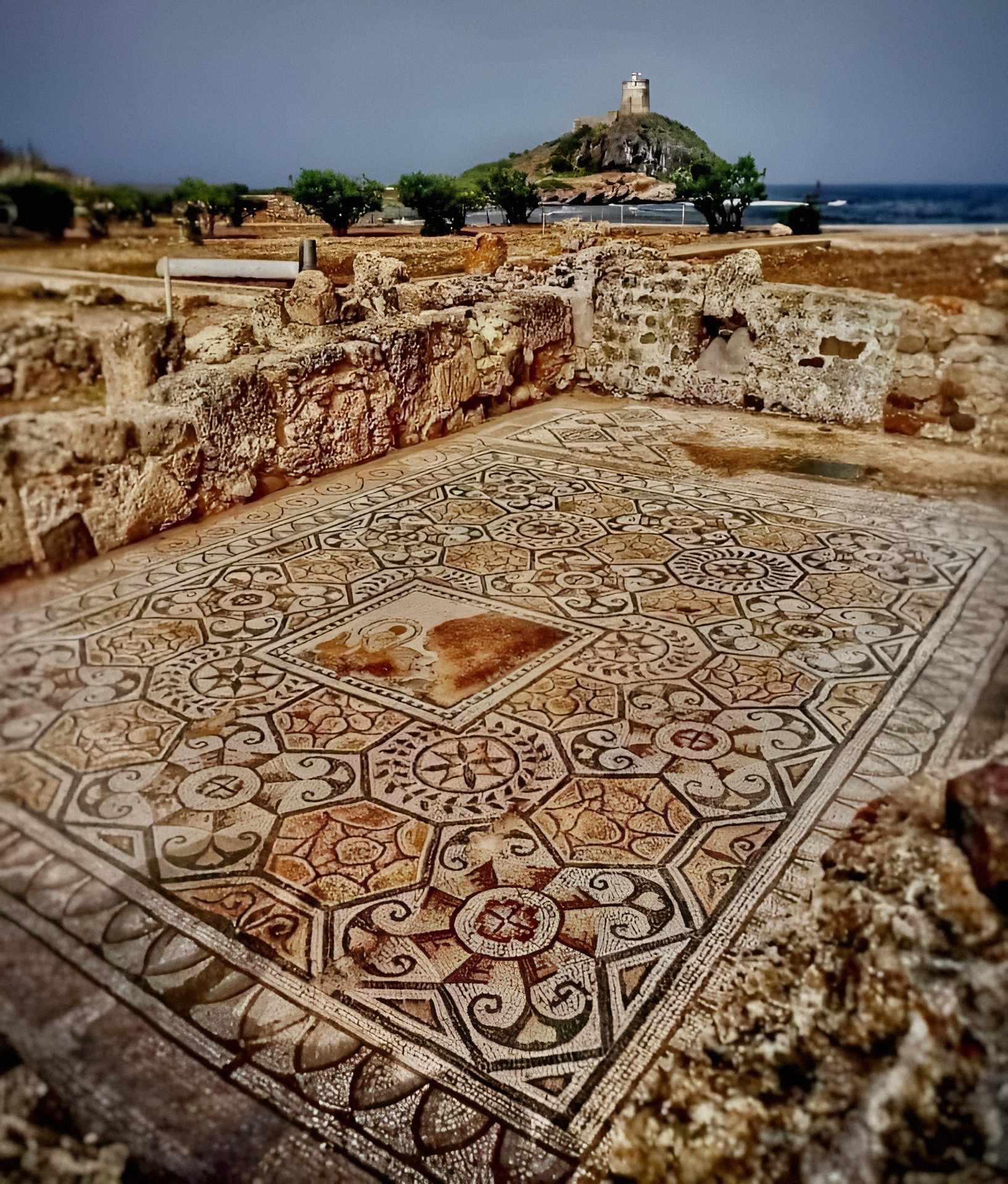 이탈리아 사르데냐 Sardinia 노라 Nora의 풀라 고고학 공원 [Pula Archaeological Park]에서 발굴된 테트라스타일 Tetrastyle 집 로마시대 모자이크 바닥(서기 2세기).