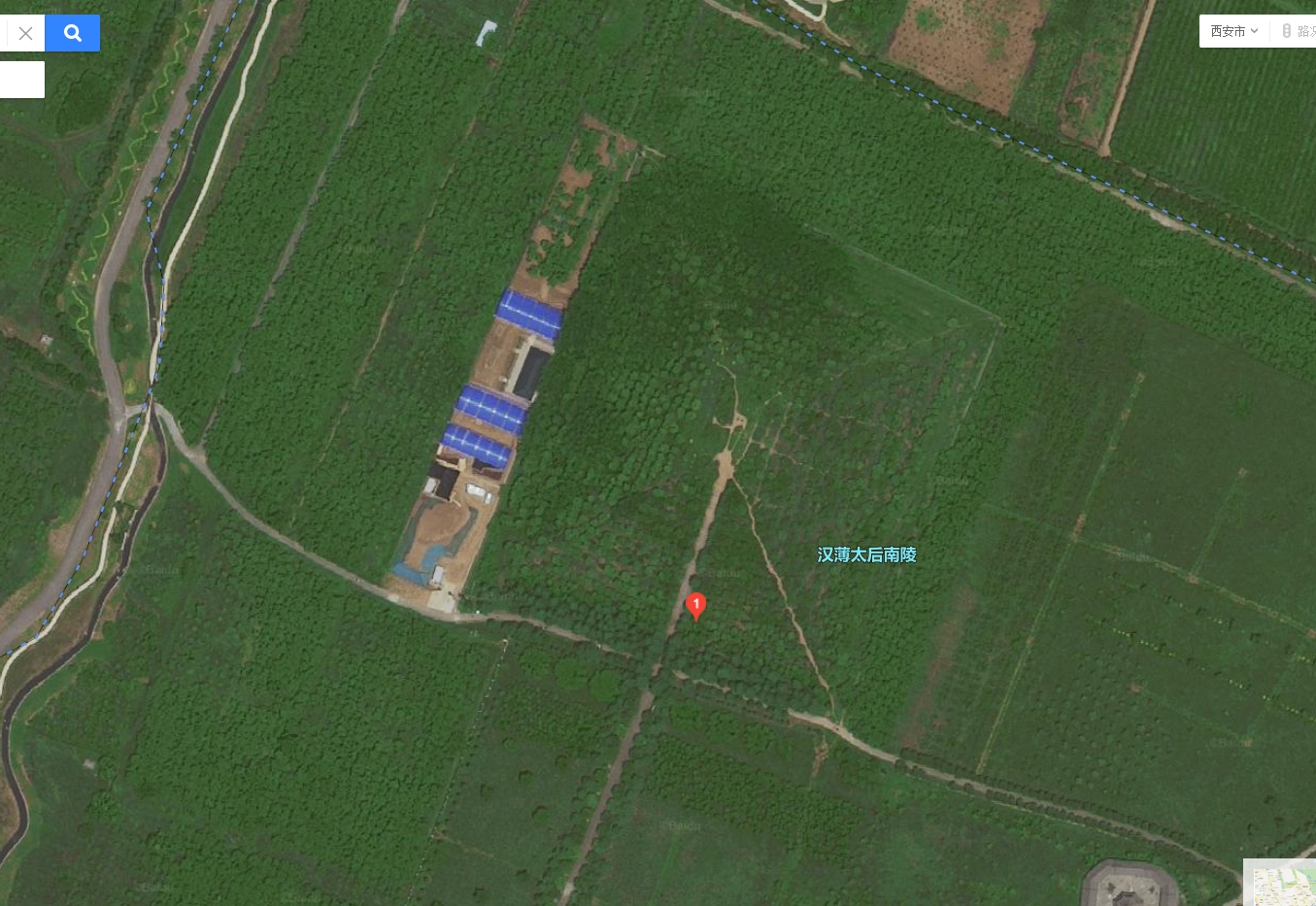 그러면서 이참에 그 인근에 있는 그의 엄마 박태후薄太后 무덤도 파제낀 모양이라, 그것을 바이두 위성사진을 통해 검색하면 아래와 같다.