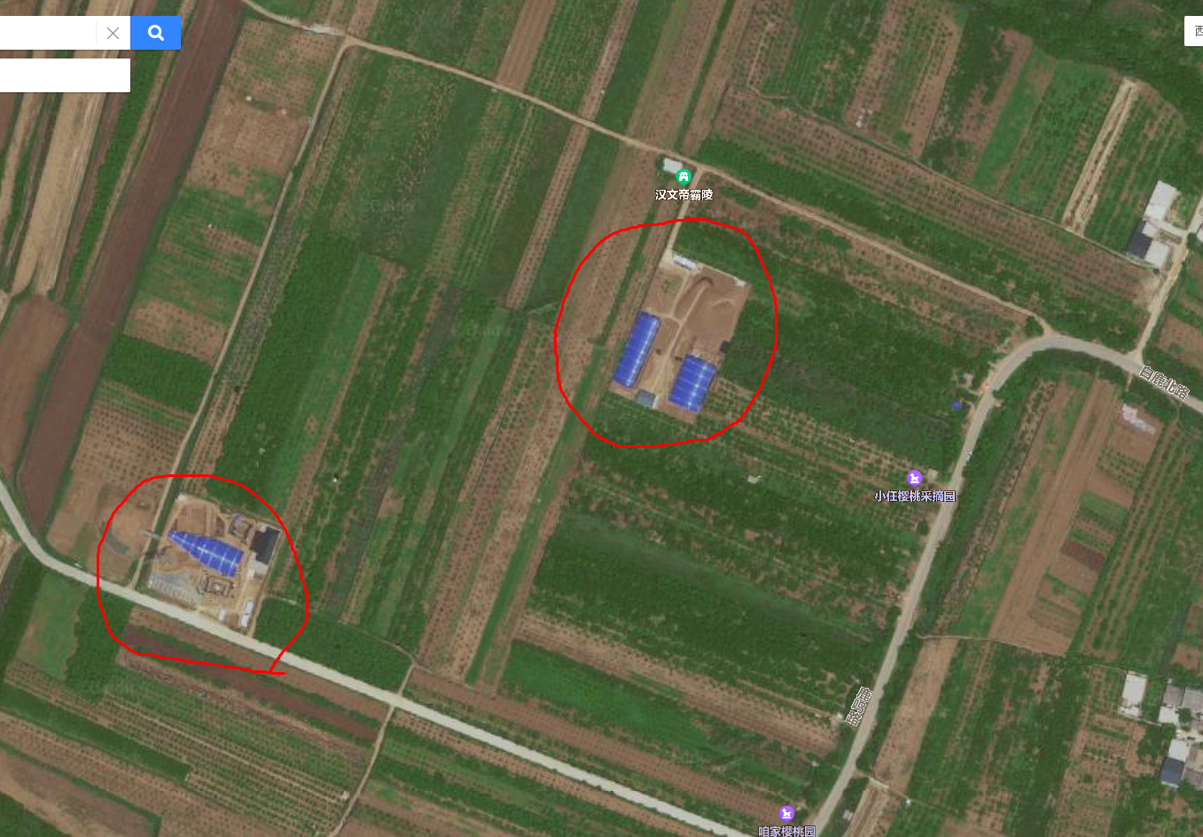 그러면서 이참에 그 인근에 있는 그의 엄마 박태후薄太后 무덤도 파제낀 모양이라, 그것을 바이두 위성사진을 통해 검색하면 아래와 같다.