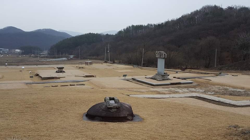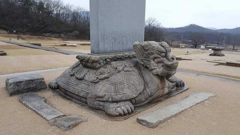 The tortoise-shaped pedestal and ornamental capstone of the Stele for Buddhist Monk Wonjong, a stone monument built to honor highly learned Buddhist Monk Wonjong, were found at the Godalsa Temple Site (Treasure No. 6).