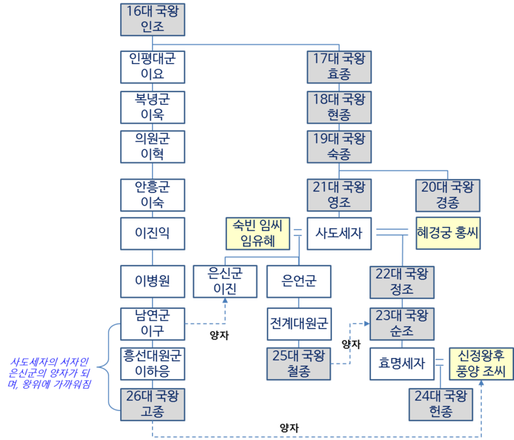 누구나 고종은 인평대군의 혈연적 후손이었다는 것은 다들 알지만 의외로 고종 계보를 아래와 같이 인평대군부터 그리는 경우는 많지 않다.