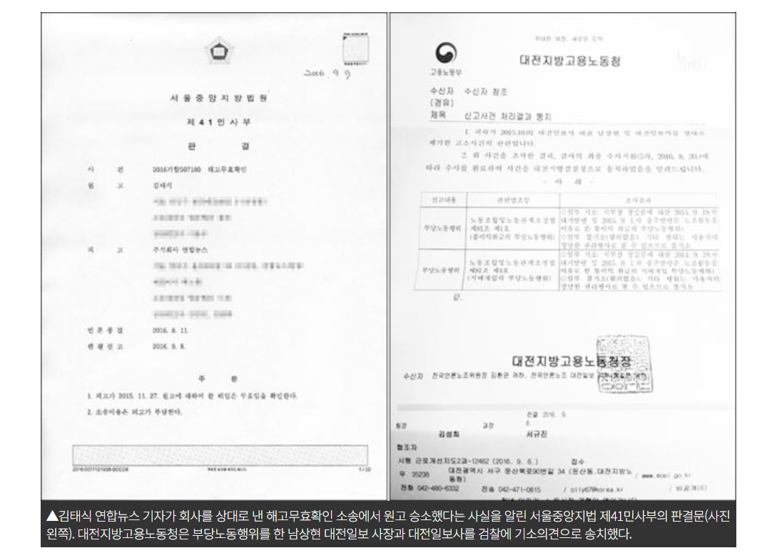 김태식 연합뉴스 기자가 회사를 상대로 낸 해고무효확인 소송에서 원고 승소했다는 사실을 알린 서울중앙지법 제41민사부의 판결문(사진 왼쪽). 대전지방고용노동청은 부당노동행위를 한 남상현 대전일보 사장과 대전일보사를 검찰에 기소의견으로 송치했다.