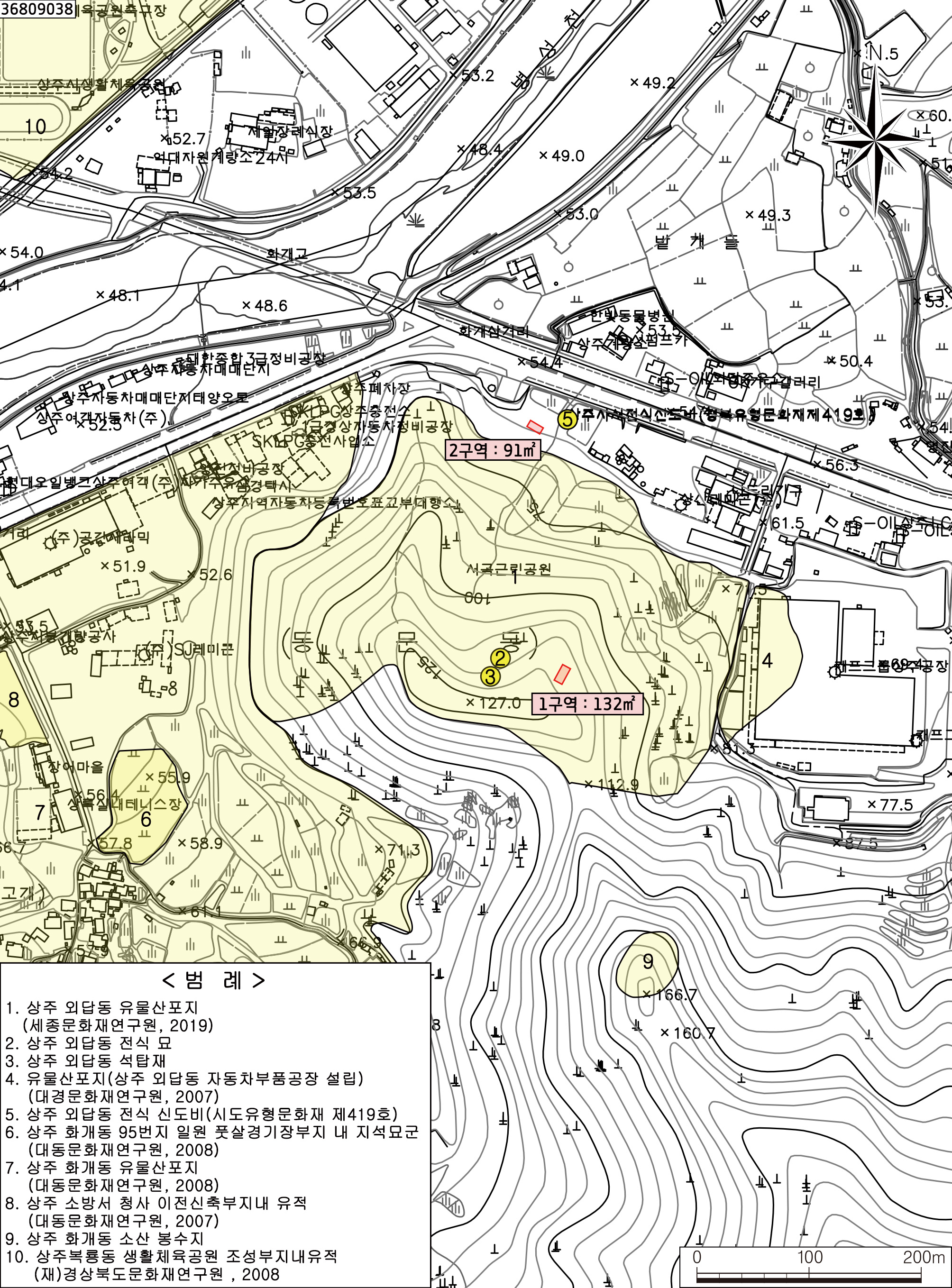 조사대상지역은 병성천 하류역 남안에 위치한 식산(503m)의 북서쪽 능선 끝자락으로, ‘상주 외답동 유물산포지’ 에 위치한다.