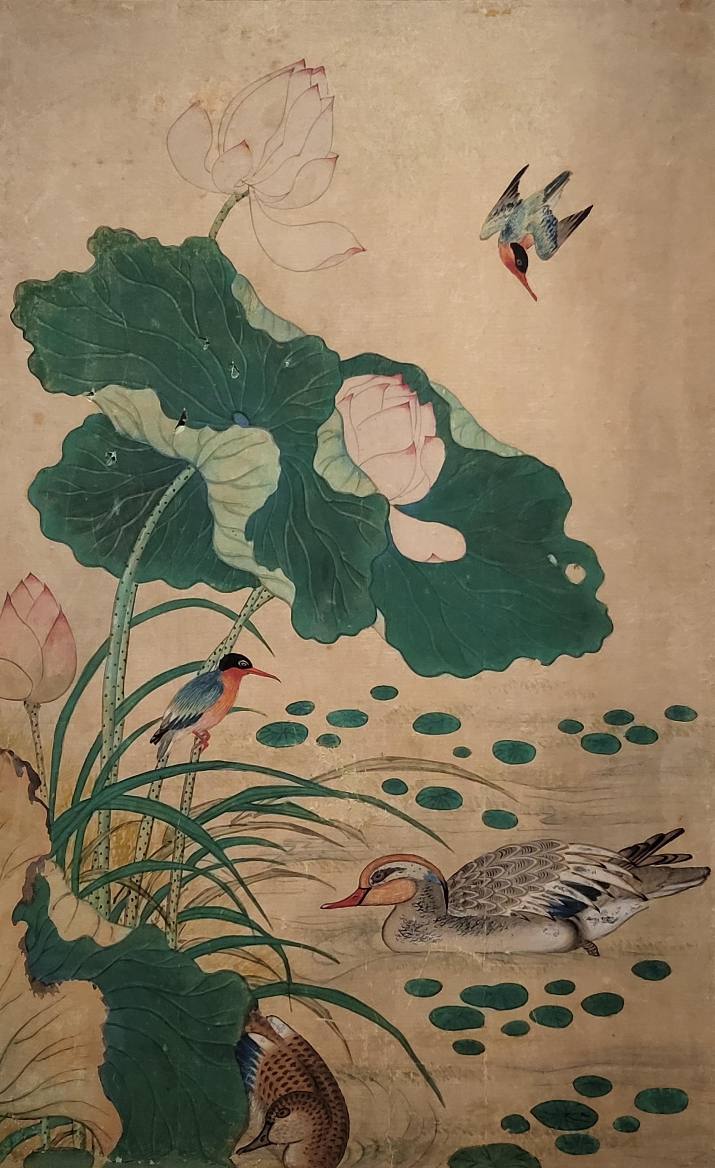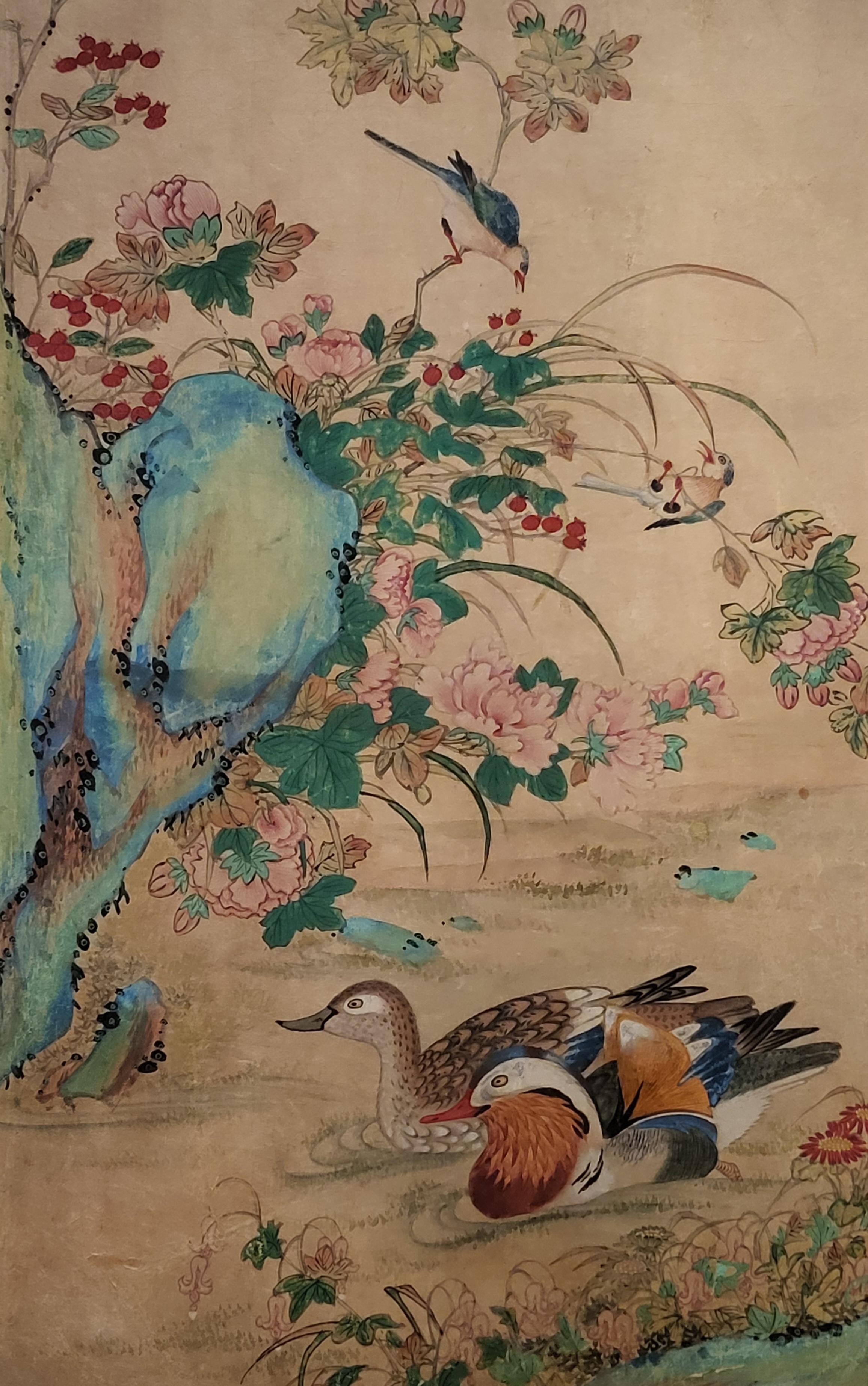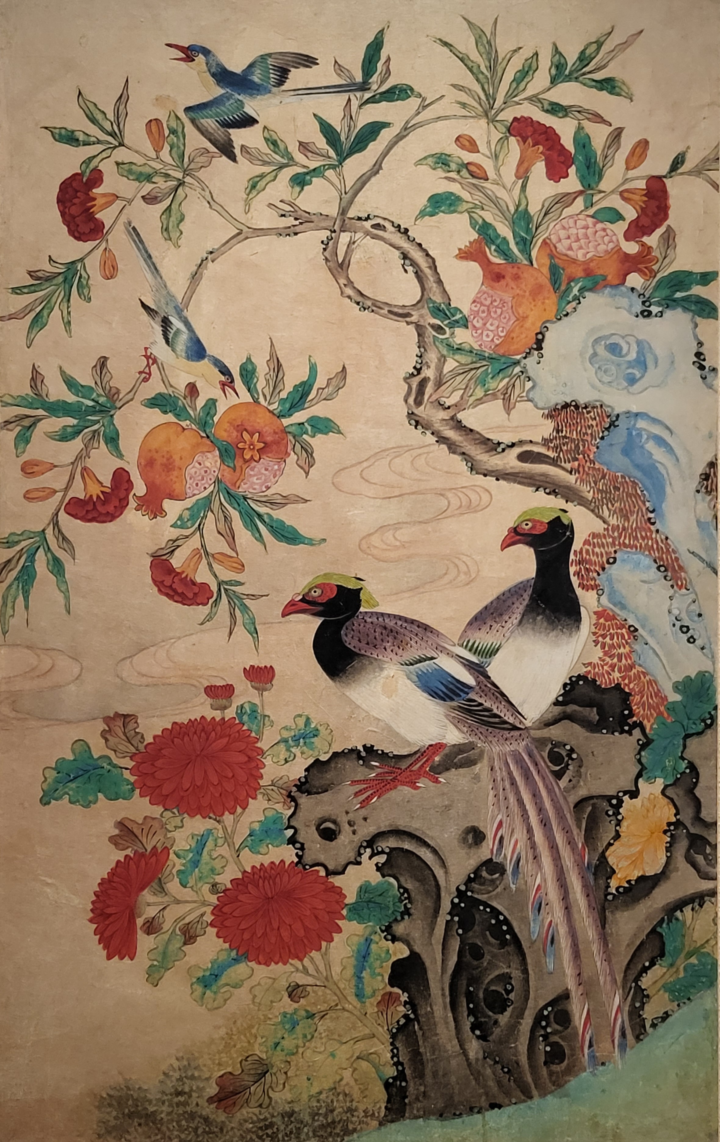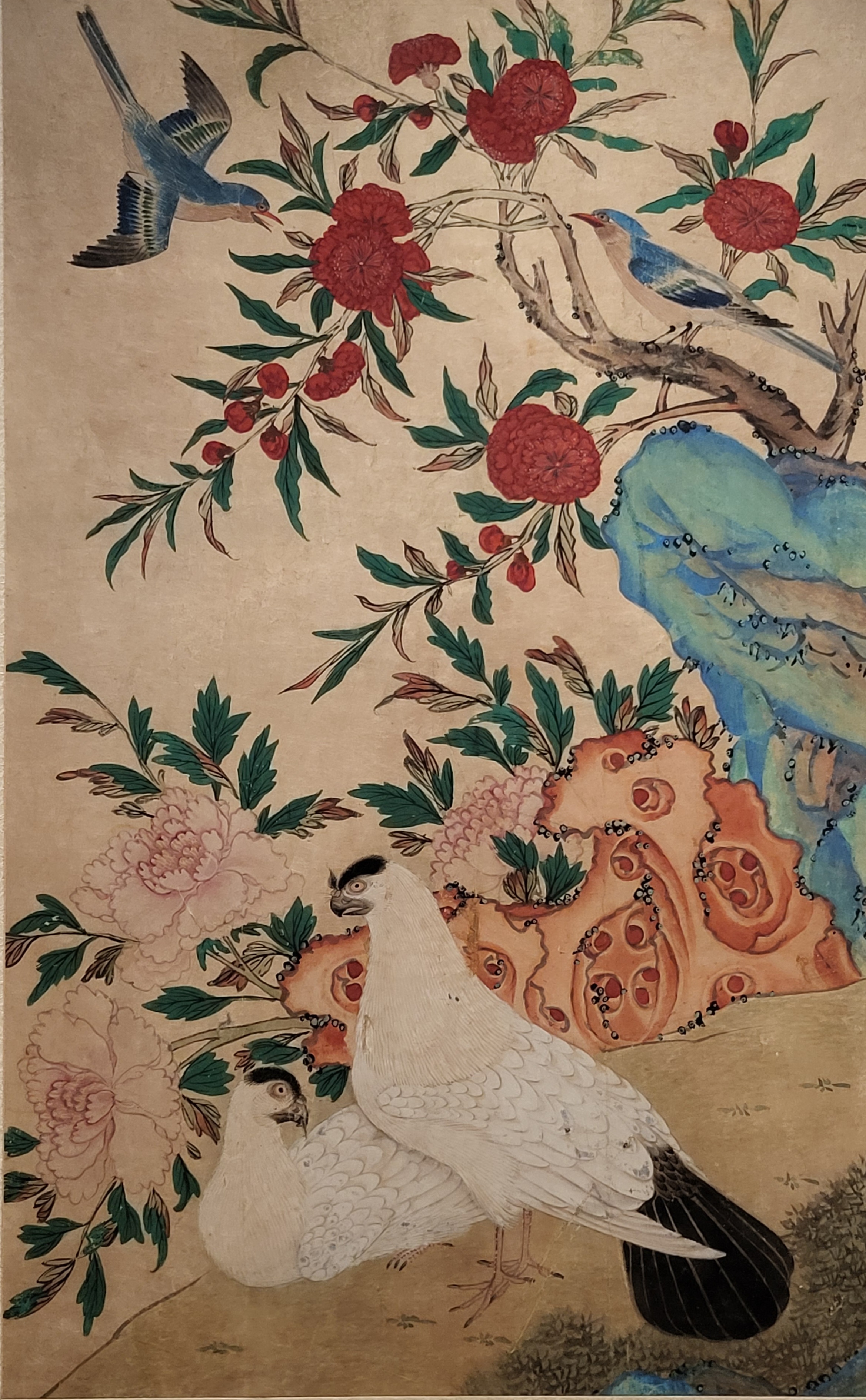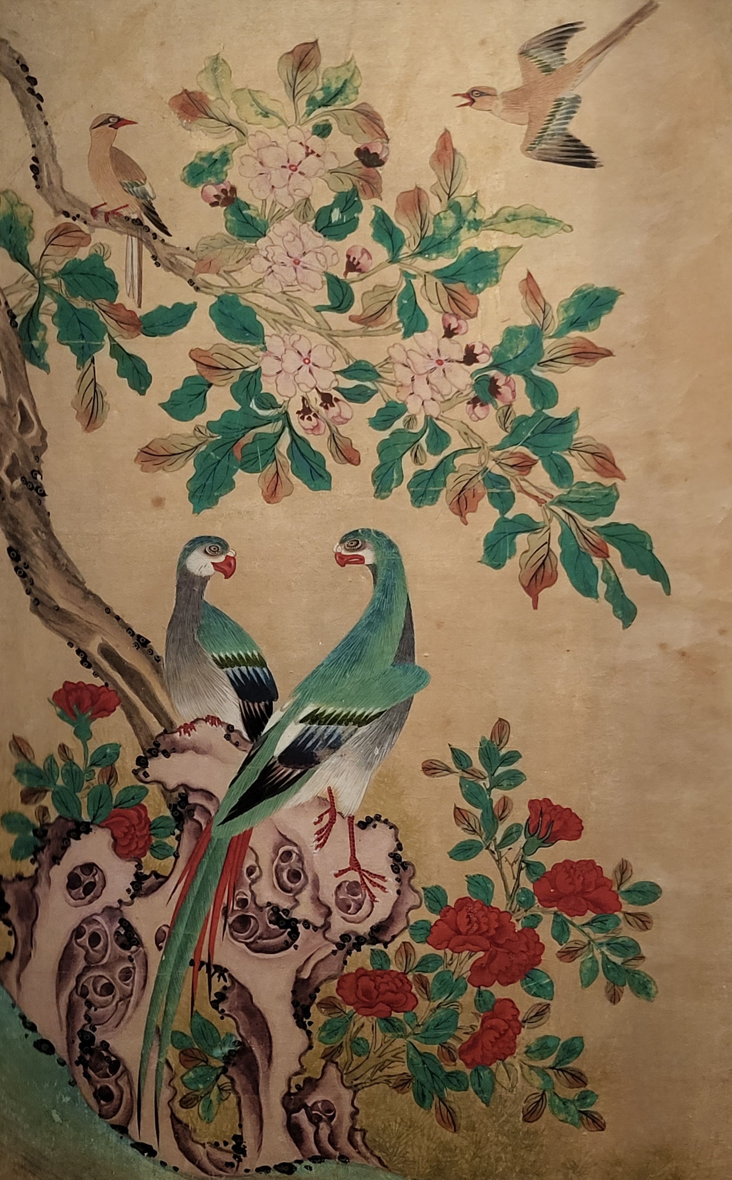 In traditional Korean paintings depicting flowers, trees, and birds, a pair of male and female birds usually blend together to symbolize a good couple and a harmonious family.