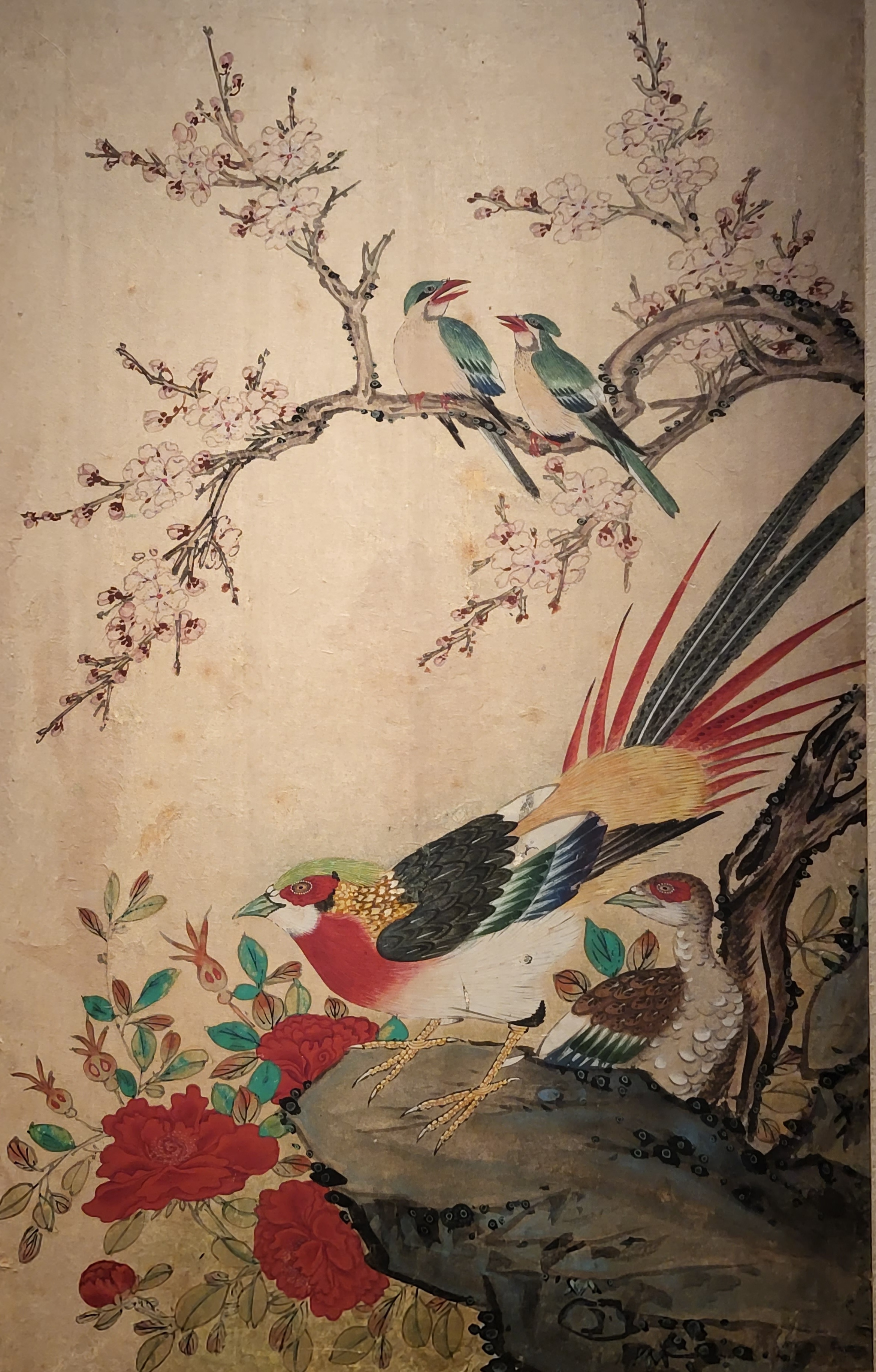 In traditional Korean paintings depicting flowers, trees, and birds, a pair of male and female birds usually blend together to symbolize a good couple and a harmonious family.