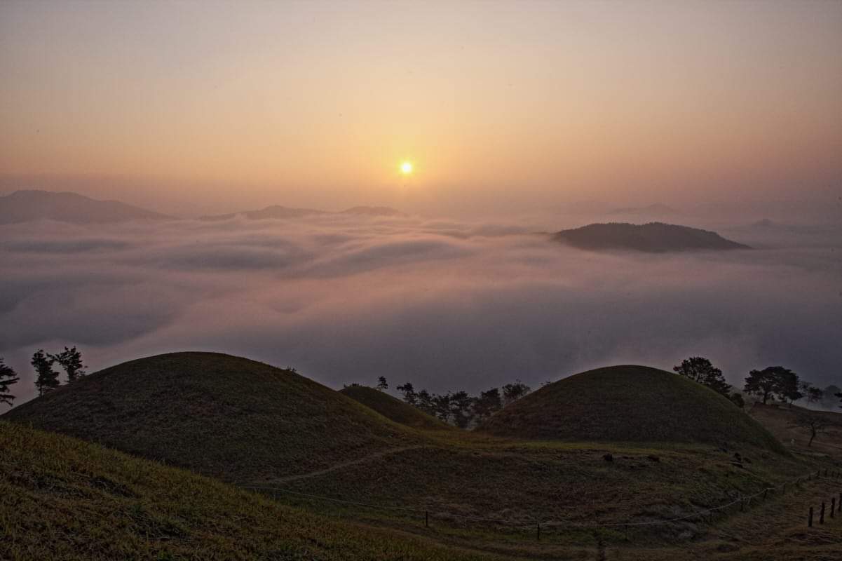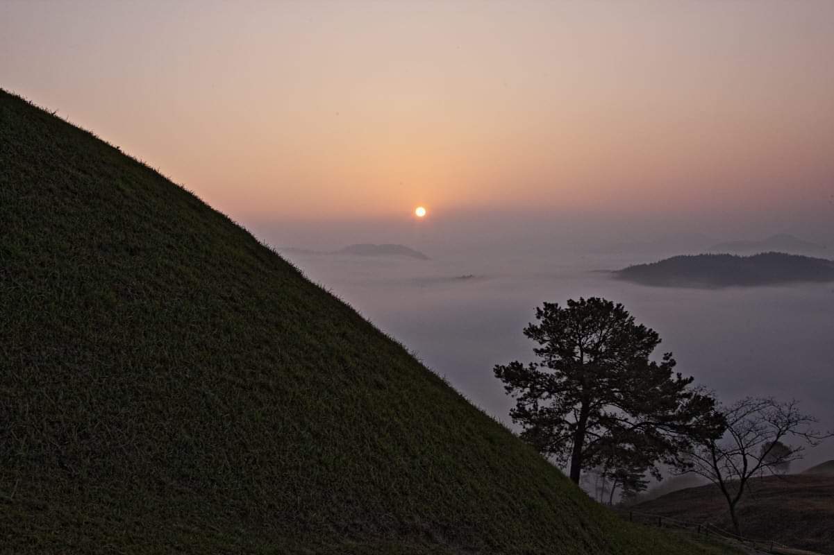 헐래벌떡 단숨에 고분군에 올라 한숨돌리고 보니 동쪽 하늘에 해가 떠오른다.