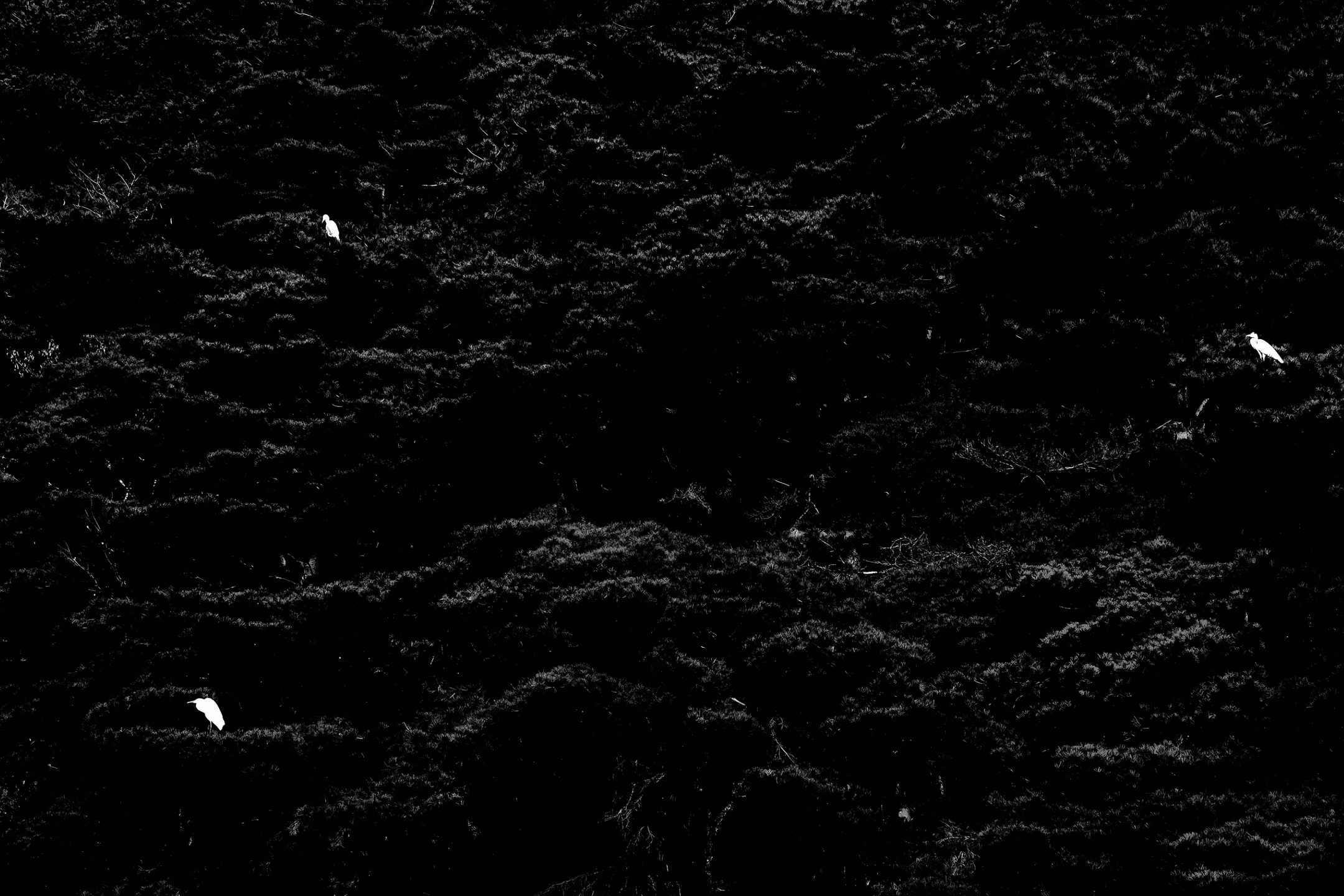 Three birds that appear to be egrets or herons are resting in a pine forest near a reservoir in Gochang-gun, Jeollabuk-do.