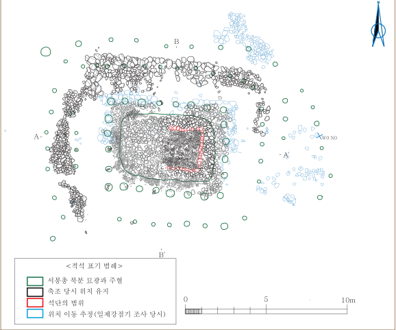 北域的封士内部确认有积石部, 积石的高度不详, 最大圆径为18.5米左右。